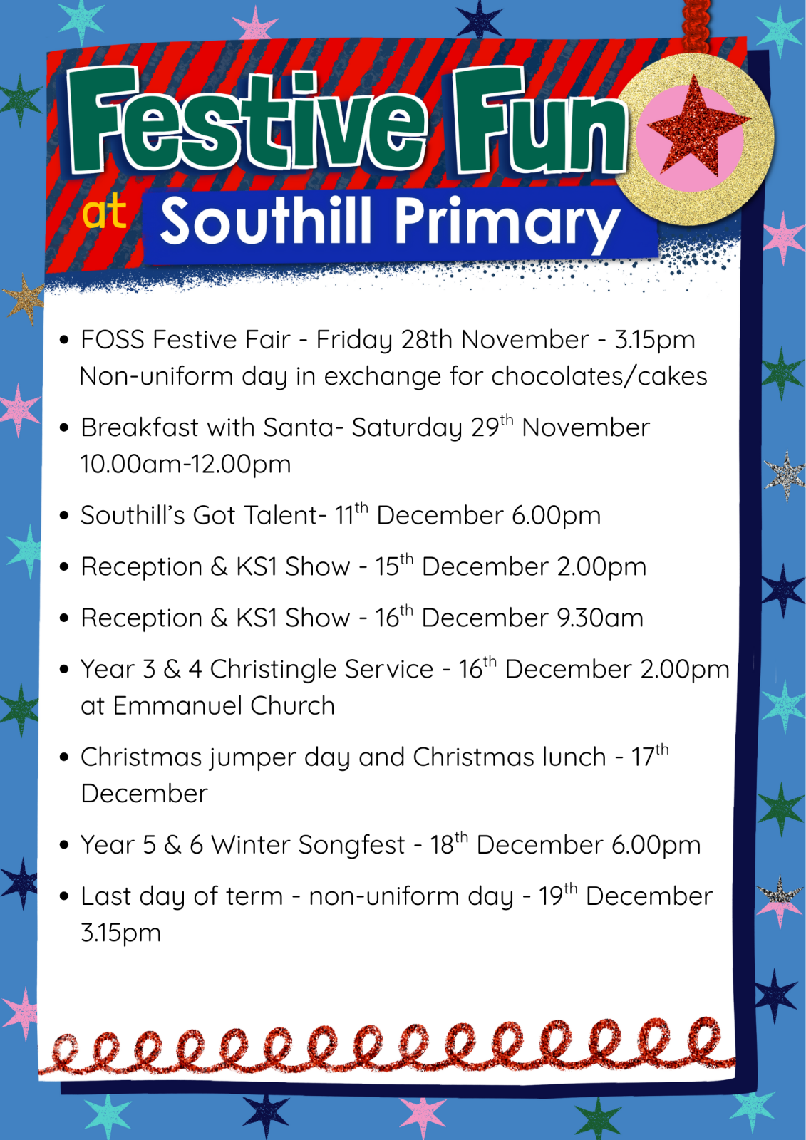 Friday 28th November 3.15pm – FOSS Festive Fair - This is always such a fun event for our whole school community. We hope to see you all there for an afternoon of festive fun. Paper plates and bags will come home with children today (Friday 21st November). Children are asked to bring in cakes and chocolates on the day of the fair in exchange for wearing non-uniform.