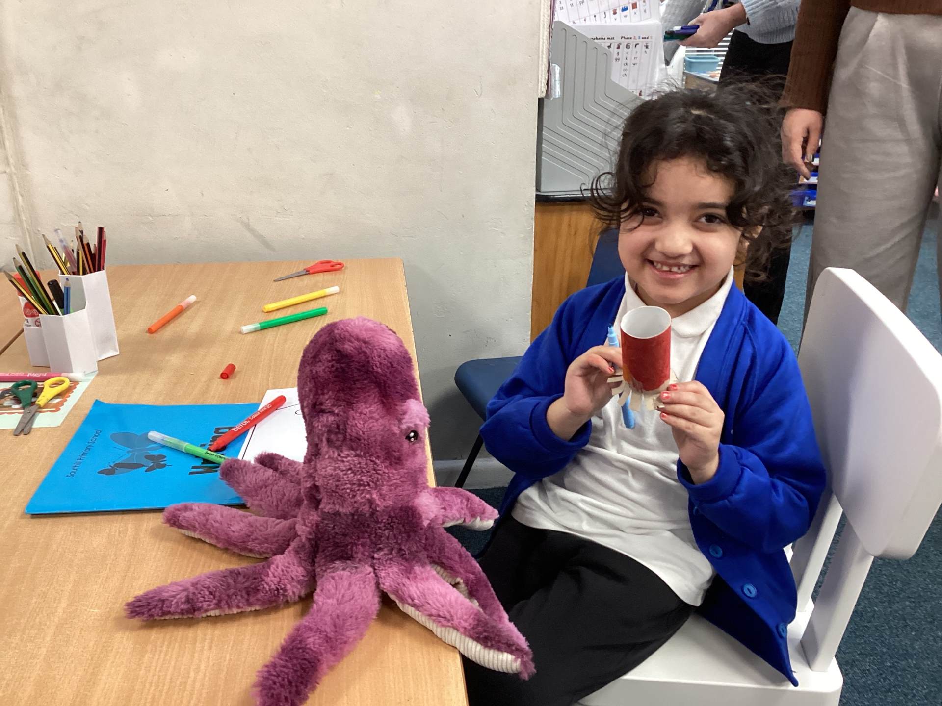 We began our morning by diving into our new book, Leo and the Octopus. The children love learning about octopuses! They got hands-on and made their very own octopuses using toilet rolls. Each octopus came complete with a special tag where the children wrote an interesting octopus fact. Did you know they have three hearts and that they use their arms to taste and touch?!