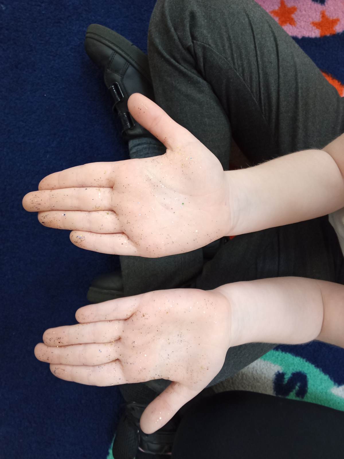 We had fun today exploring why hand hygiene is so important. We used glitter to represent germs and then passed the 'germs' around by shaking hands with each other. The children were soon all sparkly little germ carriers!