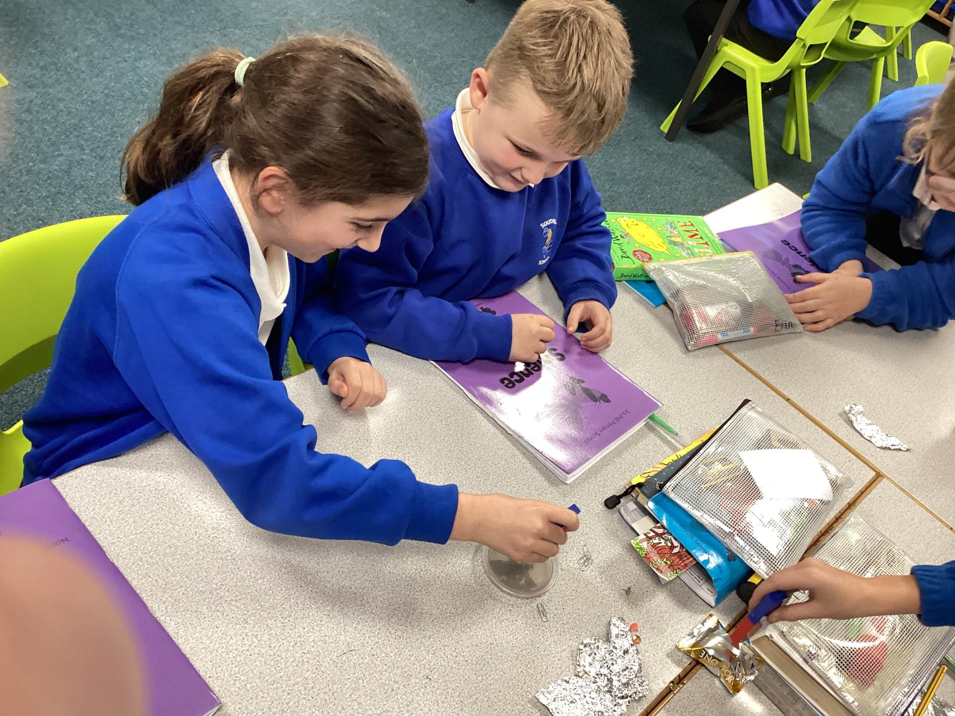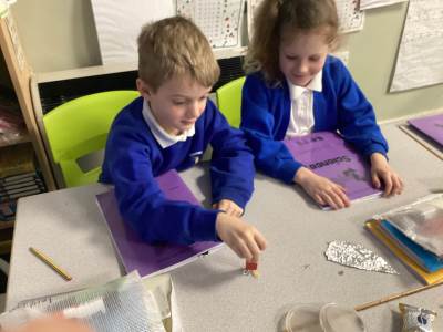 Continuing with our Science unit, Forces and Magnets, the children explored different metals and metallic objects to see if they were magnetic or non-magnetic. Before having a magnet, the children were given a variety of materials to handle and were asked to make a prediction as to whether it would be magnetic or non-magnetic. There was lots of discussion and reasoning and once all children had made their predictions magnets were handed out. The children really enjoyed feeling the 'pull' of the magnet and watching the magnetic objects move towards to magnet. One group tricked me into thinking that aluminium foil was magnetic, by wrapping magnetic objects up in it!