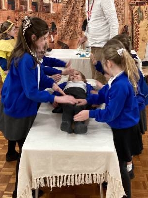 At the end of the day the parents were invited in to a short reenactment of how a body would have been preserved and mummified. One of our pupils was super brave and took on the role of being 'washed', 'rubbed with oil' and 'bandaged up' and as it was ancient Egypt, even had all her organs removed and stored in canopic jars!