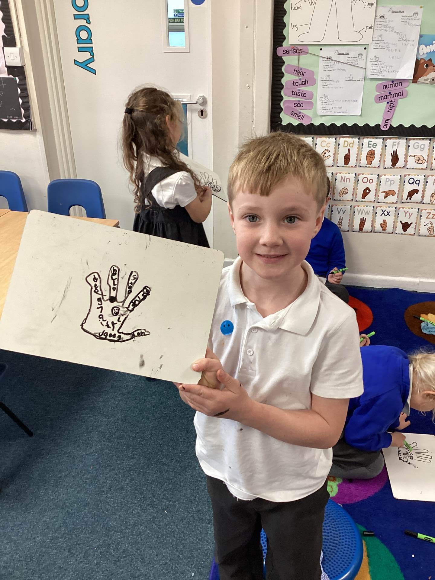 After that, we drew around our hands and wrote down our anti-bullying superpowers, such as: