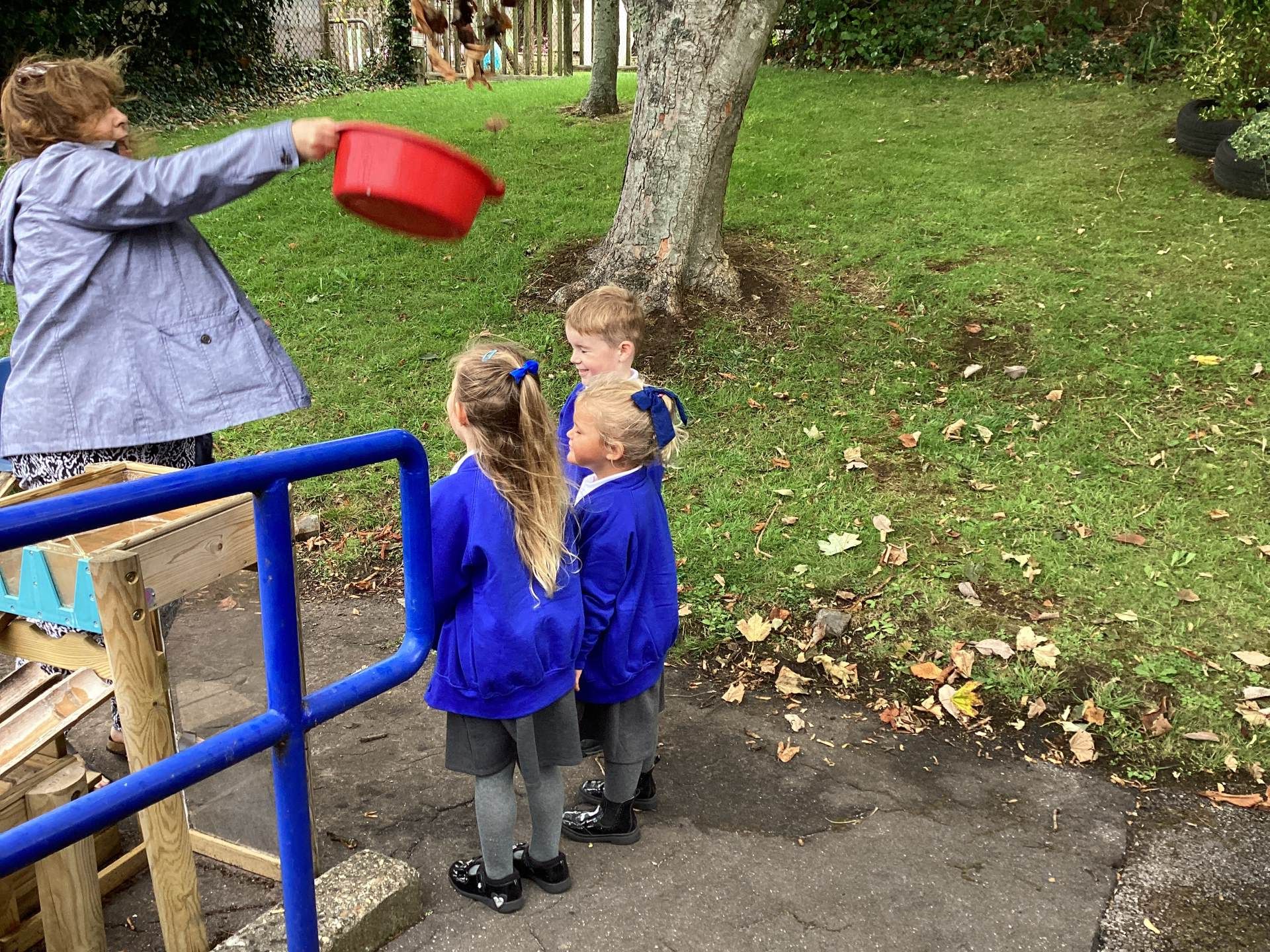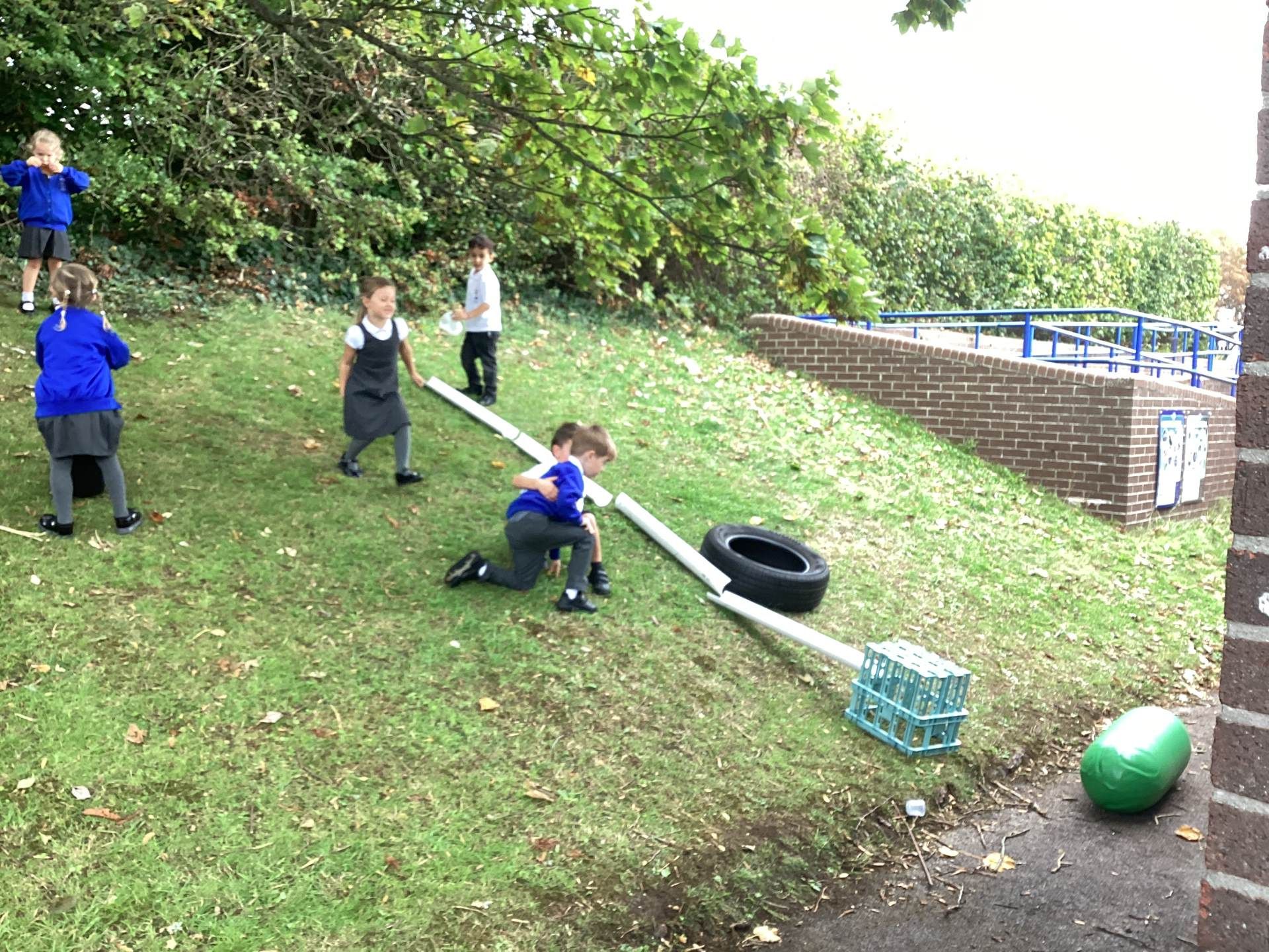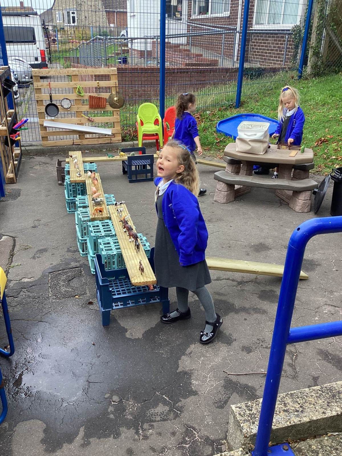 - Outdoor Exploration: Some of us created a track with guttering and were amazed to watch the water flow down. We also had lots of fun when Mrs Kench poured a bucket of dry leaves over our heads – it was extra windy!