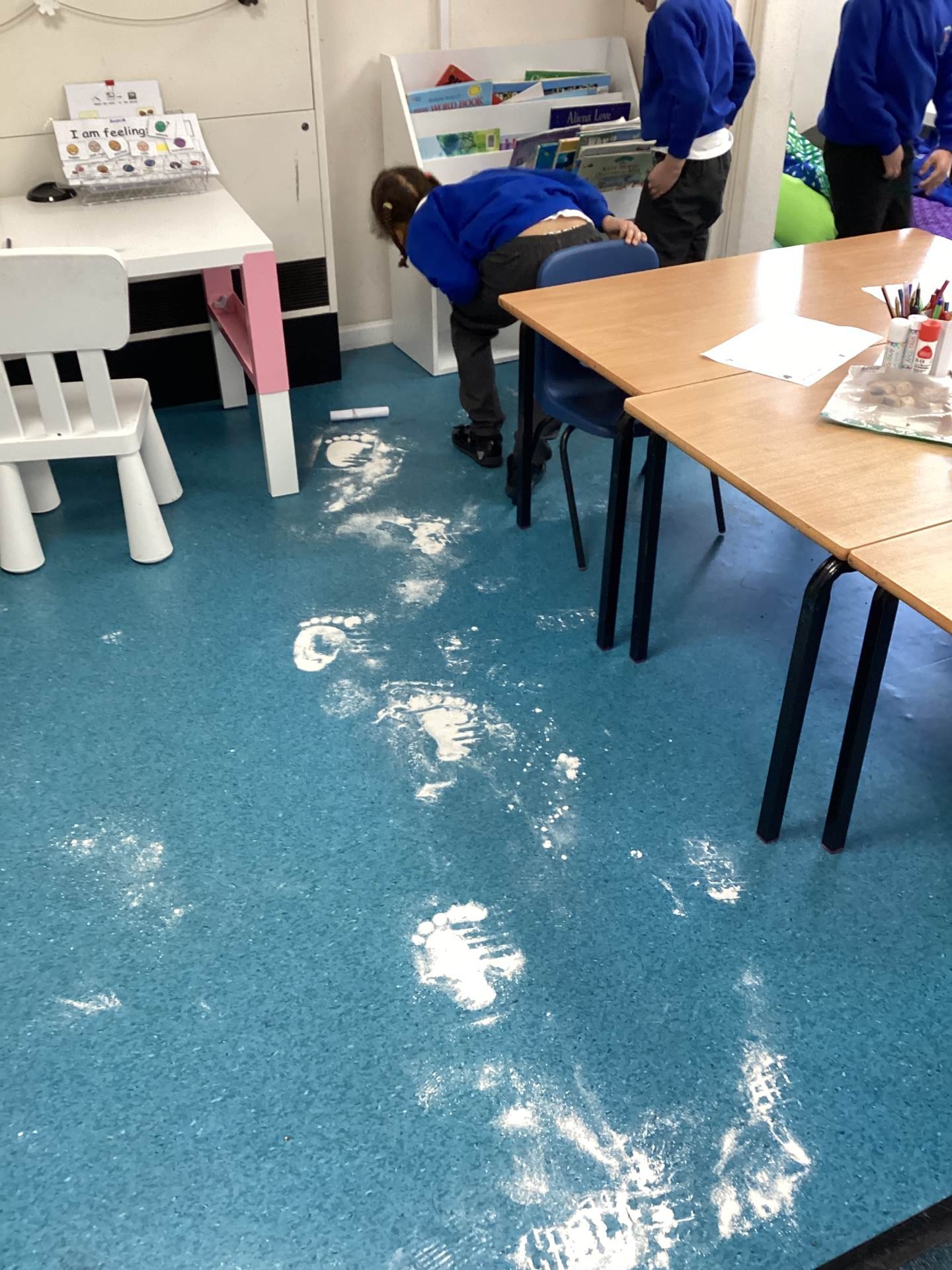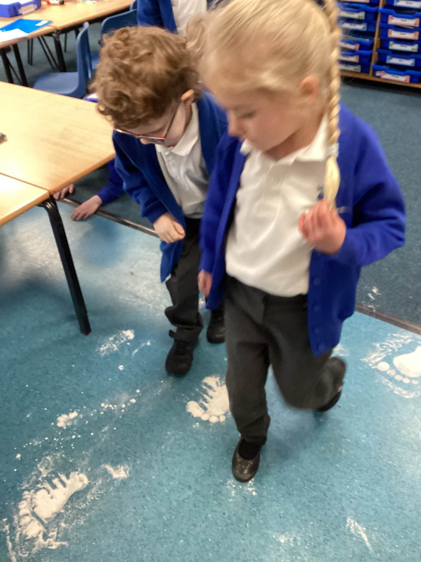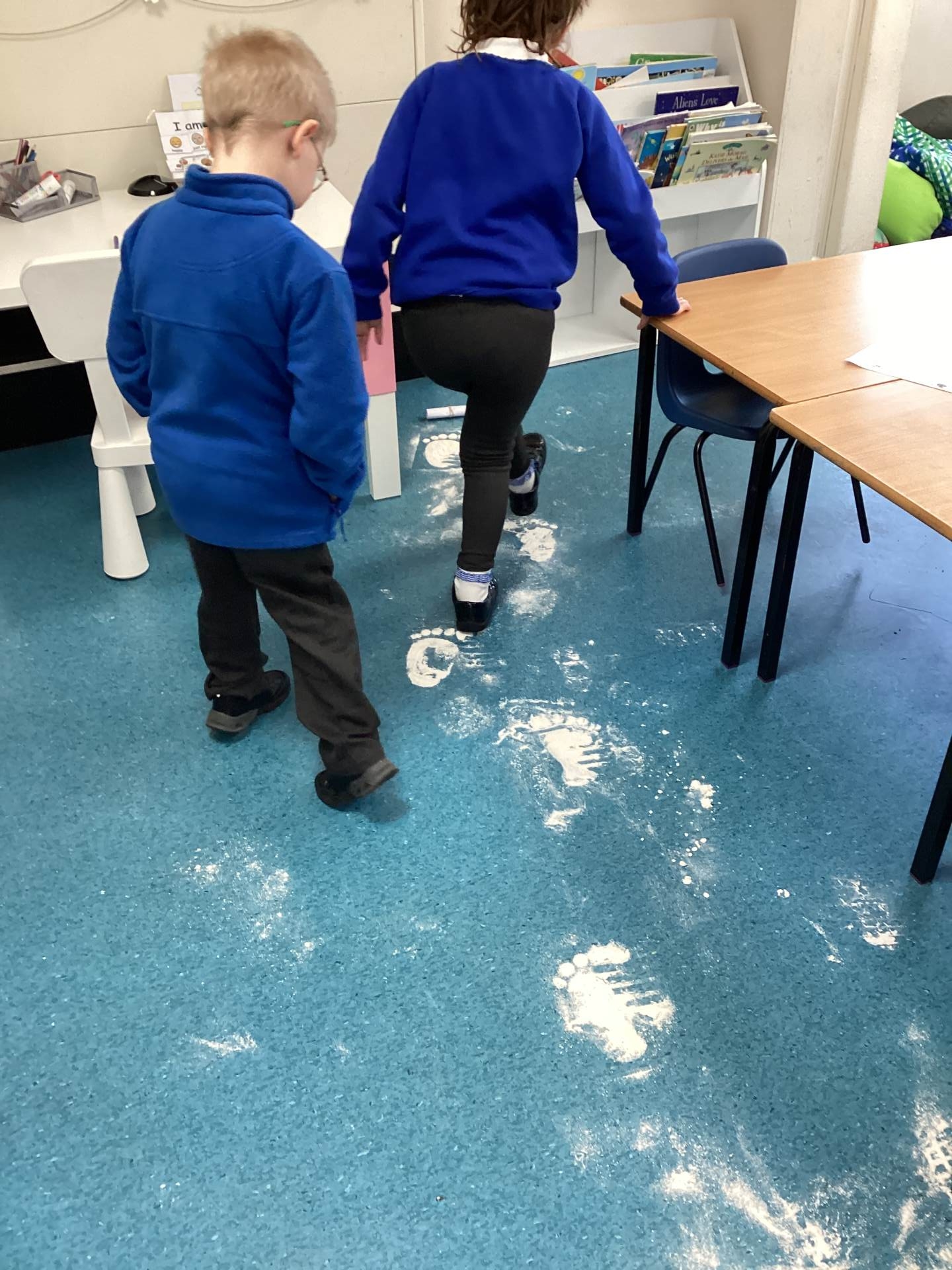 As the children walked into the classroom, they stopped in their tracks. Stretching across the classroom were huge, white footprints. They were much bigger than any grown-up’s shoes and looked very mysterious indeed!