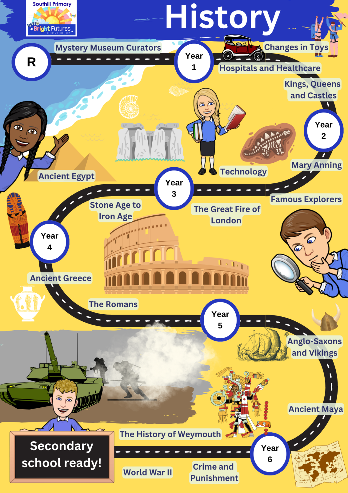Our Bright Futures Curriculum identifies the key knowledge and skills of each history topic and consideration has been given to ensure progression across topics throughout each year group across the school. By the end of year 6, children will have a chronological understanding of British history from the Stone Age to the present day. They are able to draw comparisons and make connections between different time periods and their own lives. Interlinked with this are studies of world history, such as the ancient civilisations of Greece and the Mayans.