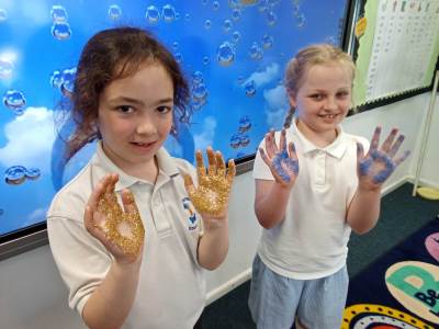We had fun today exploring why hand hygiene is so important. We used glitter to represent germs and then passed the 'germs' around by shaking hands with each other. The children were soon all sparkly little germ carriers!
