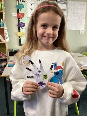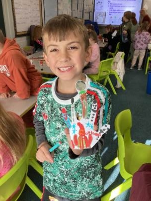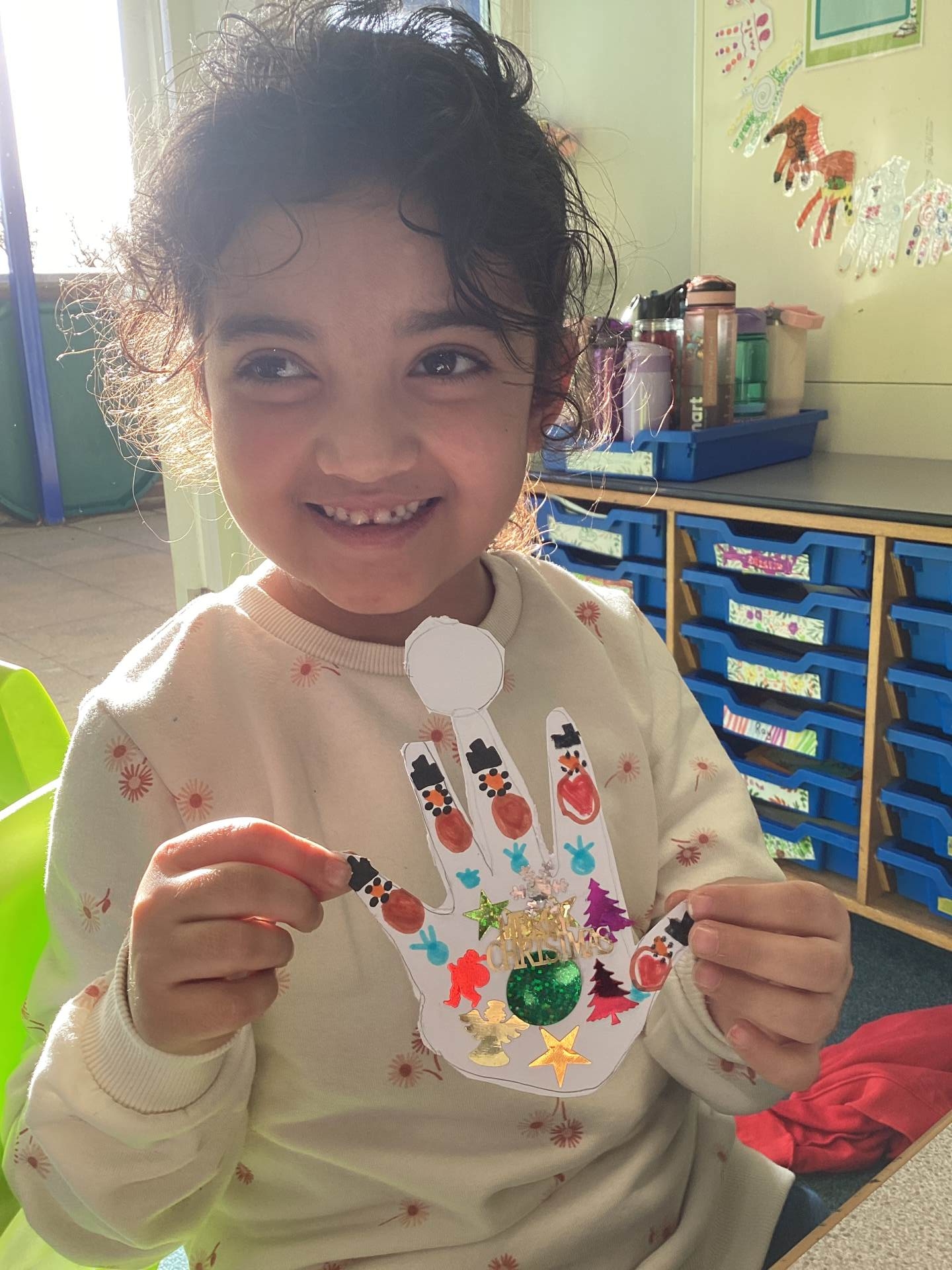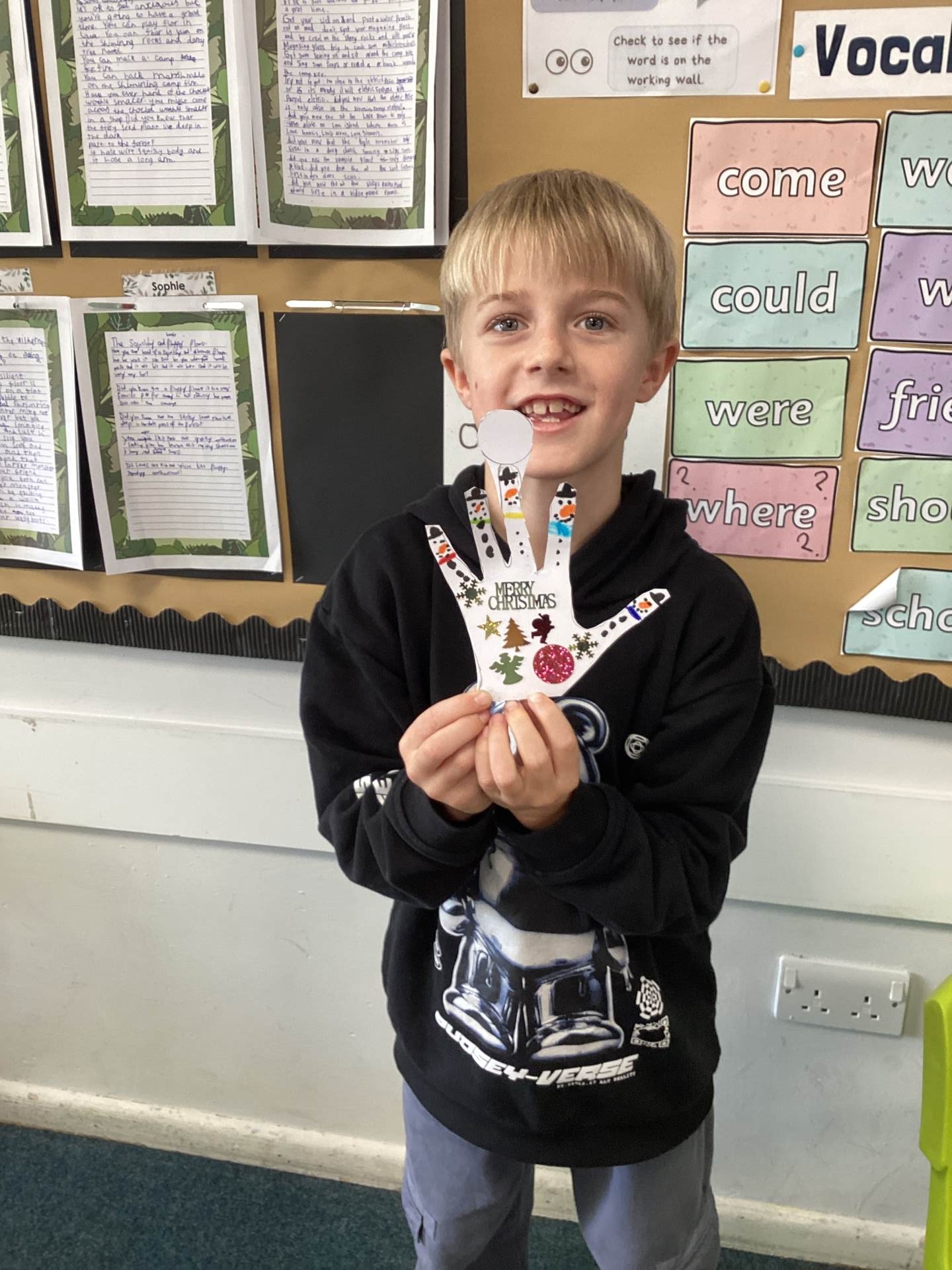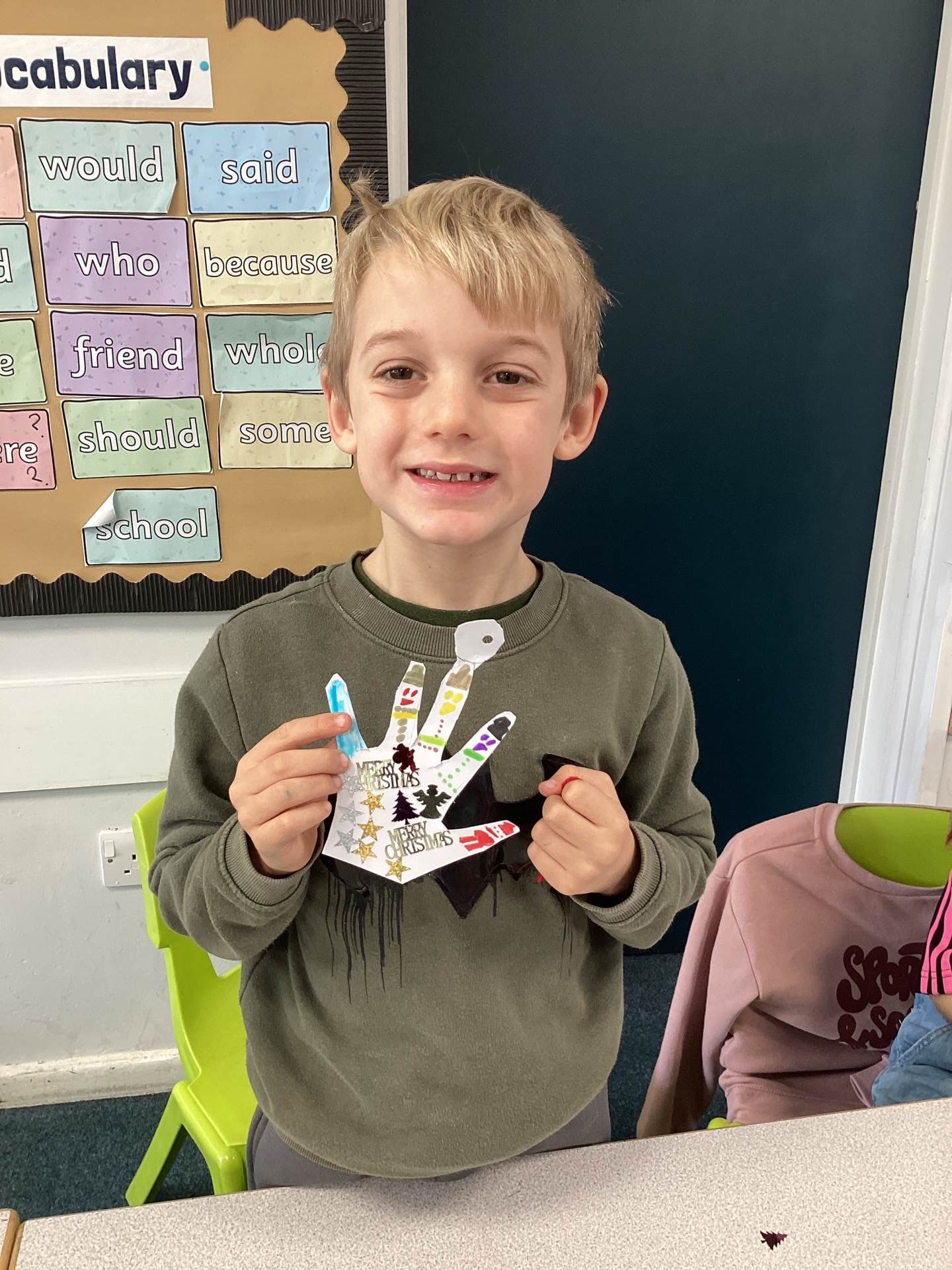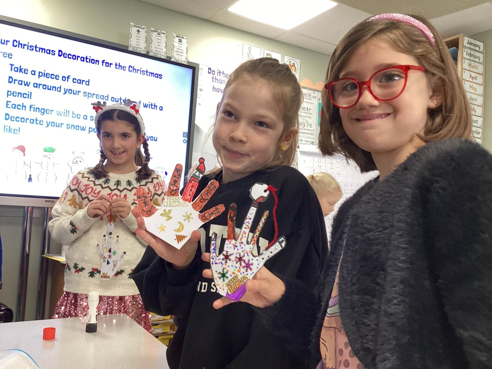 Today, in time for our Christmas Fair, the children made their decoration for the huge tree in the school hall. They used white card, drew around their hand and then decorated their drawn fingers as snow people, reindeers, Father Christmas or elves! They then used different shiny sequins to add a bit of Christmas sparkle to their fantastic decorations! Once made they then placed them on the Christmas tree next to the others made from other classes.