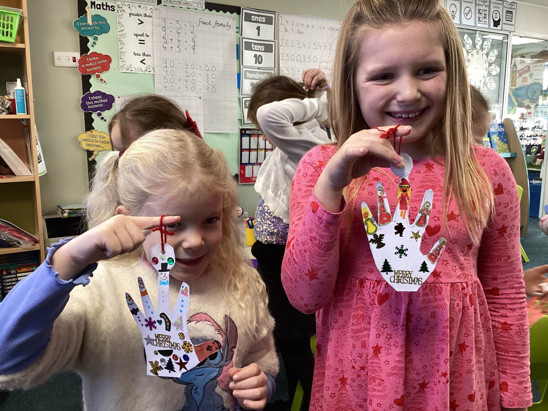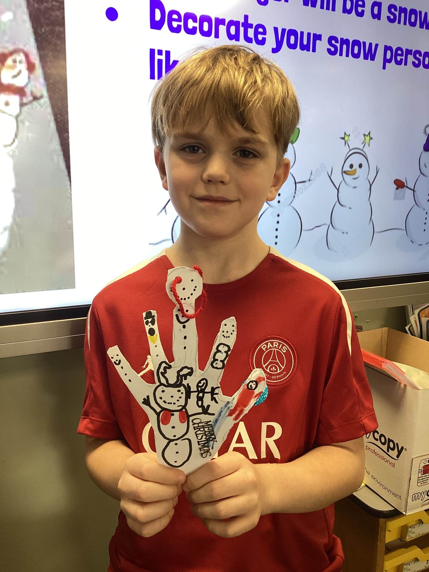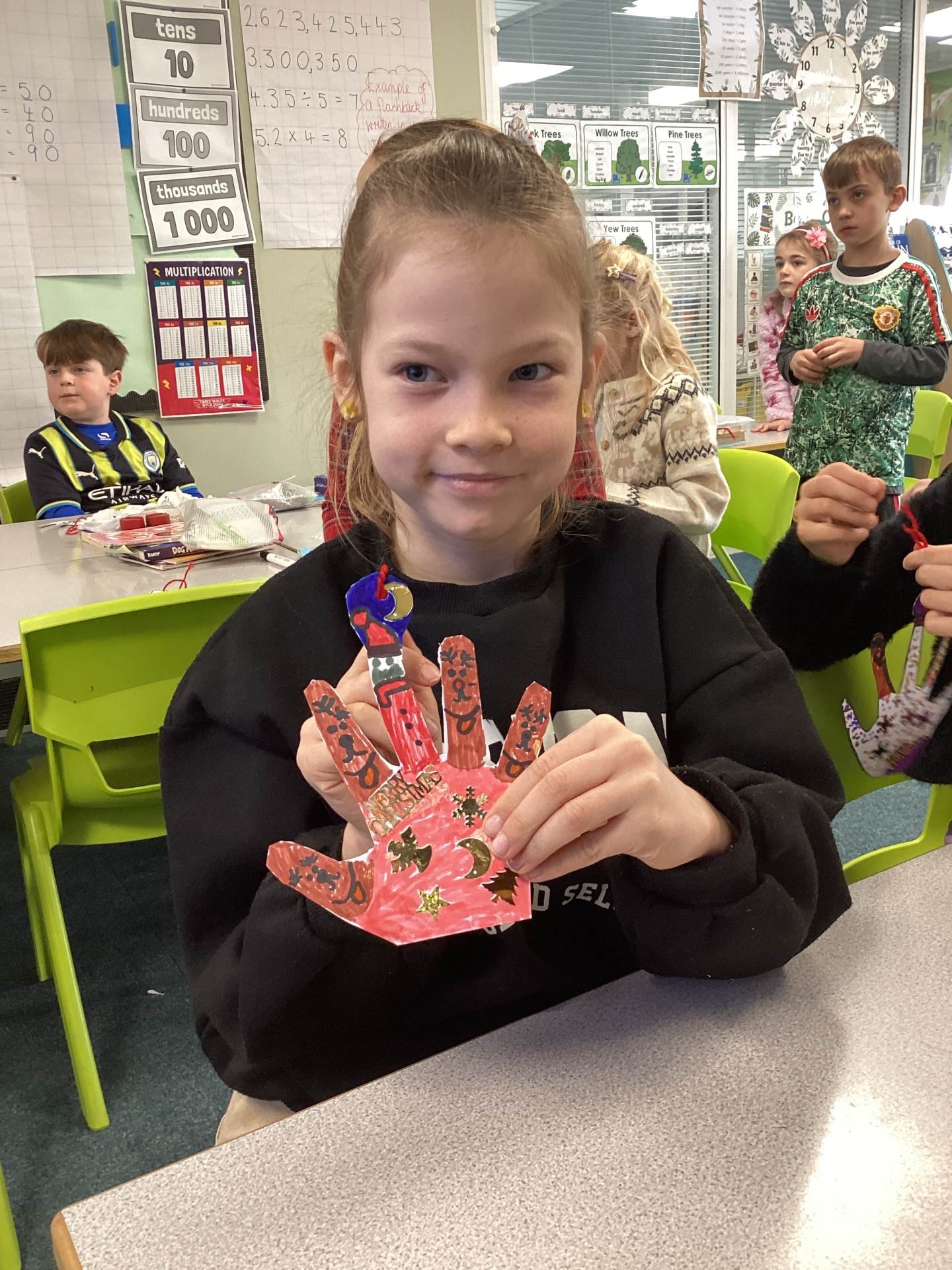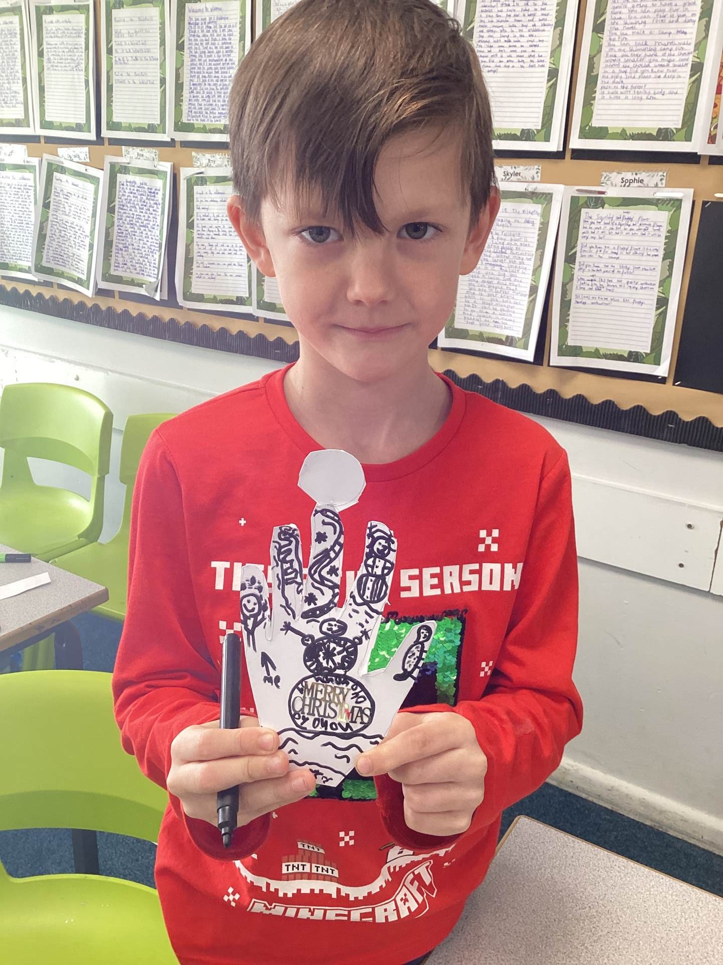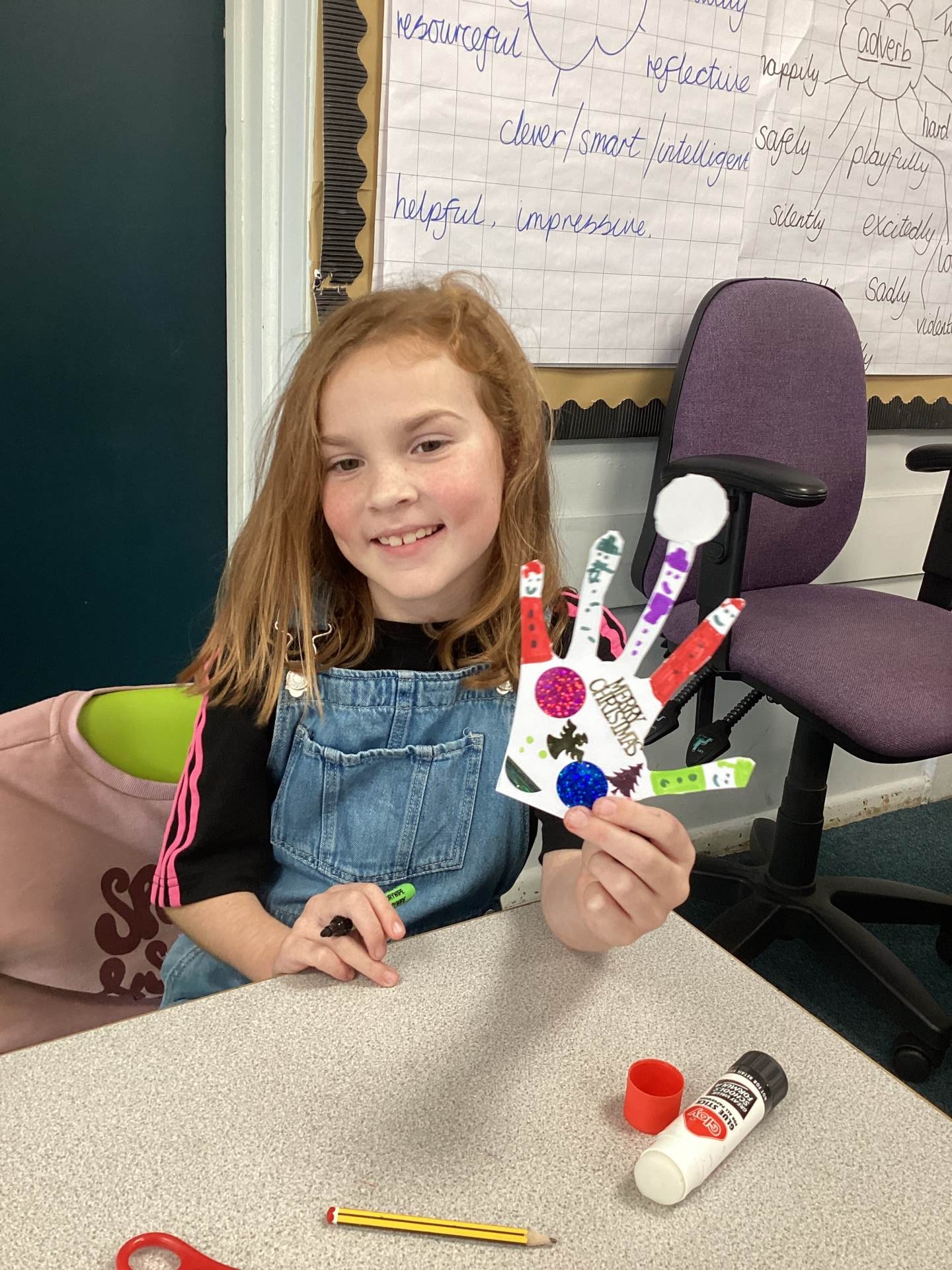Today, in time for our Christmas Fair, the children made their decoration for the huge tree in the school hall. They used white card, drew around their hand and then decorated their drawn fingers as snow people, reindeers, Father Christmas or elves! They then used different shiny sequins to add a bit of Christmas sparkle to their fantastic decorations! Once made they then placed them on the Christmas tree next to the others made from other classes.