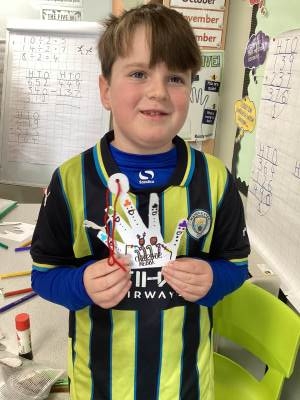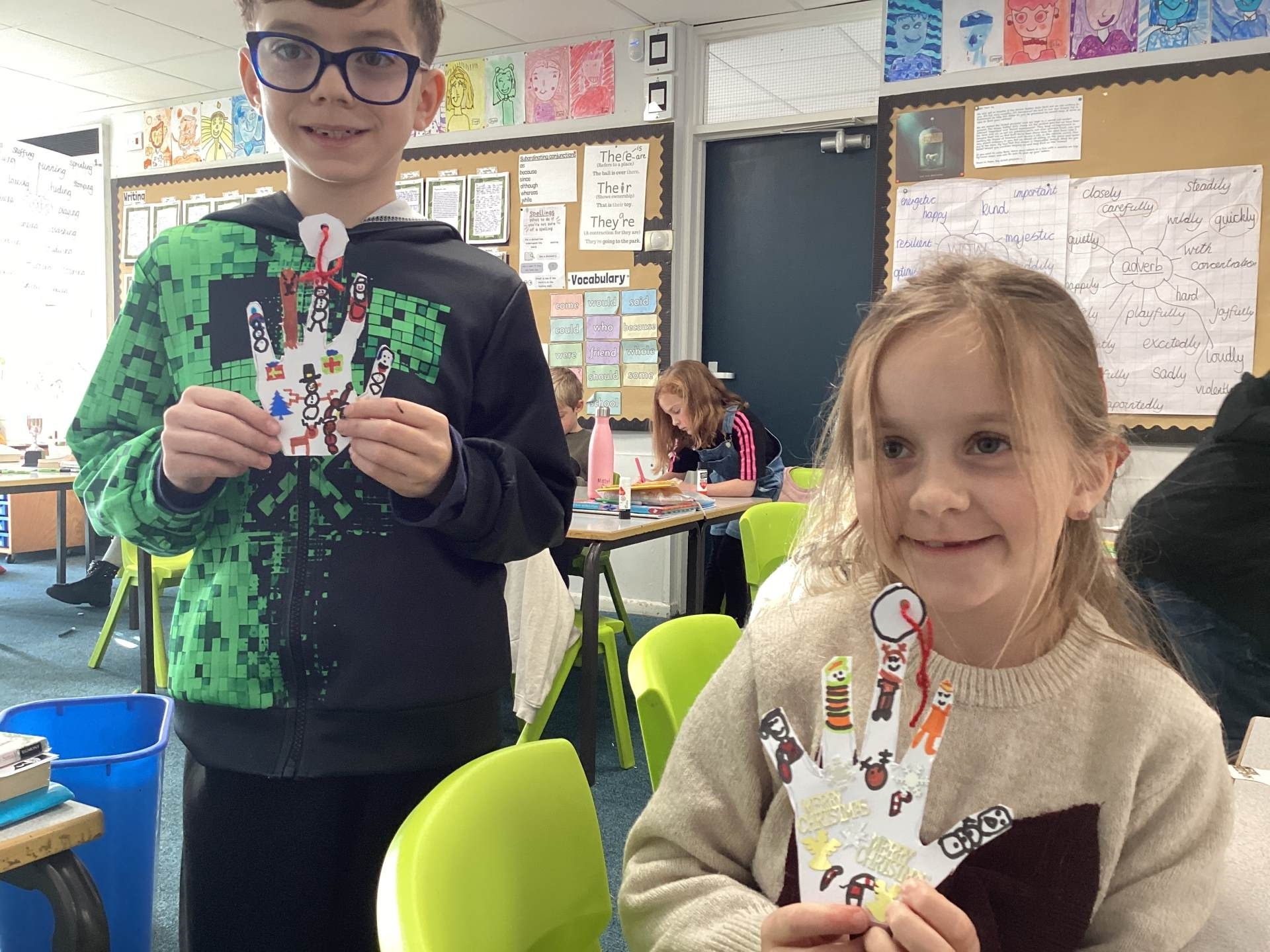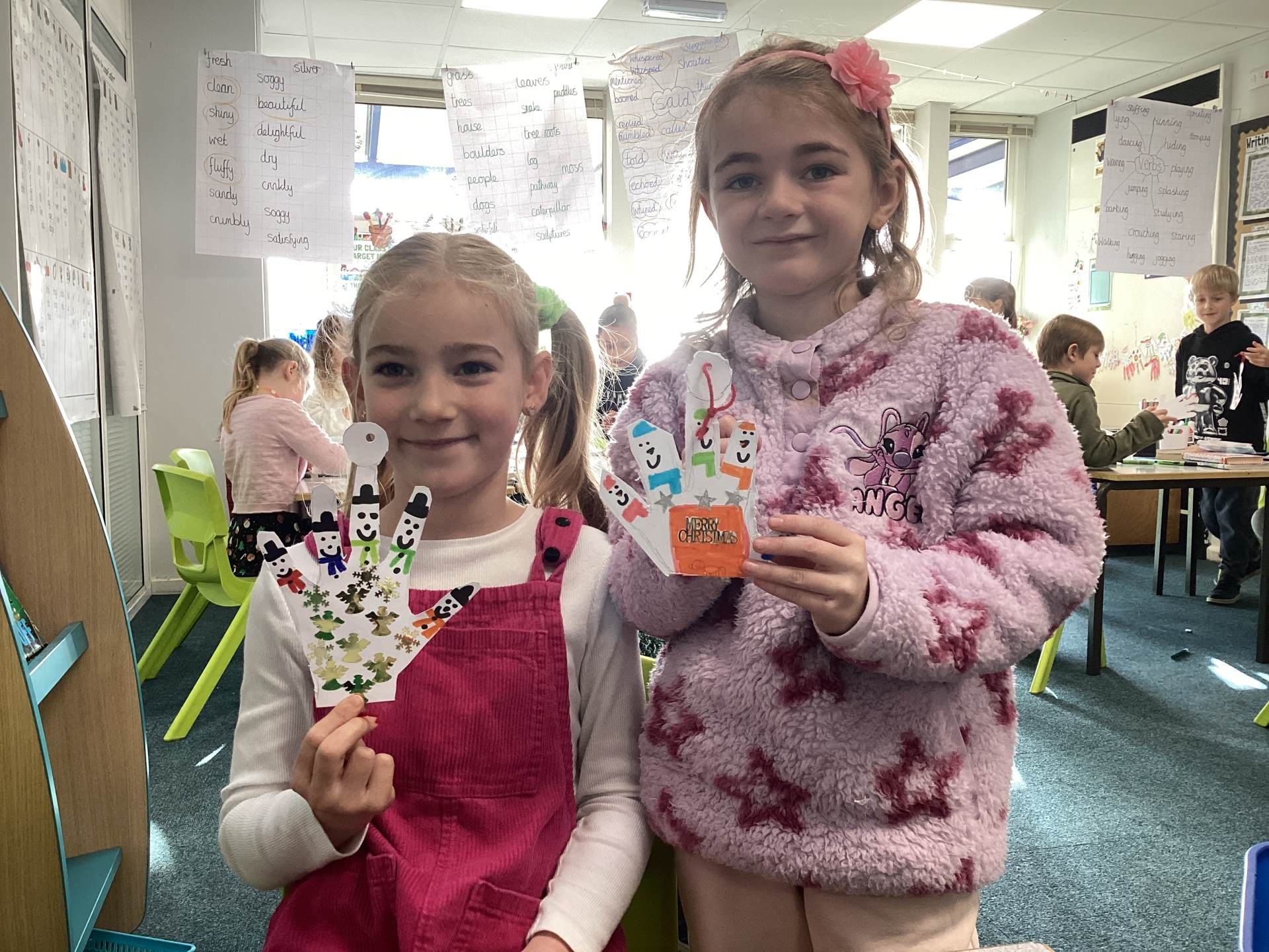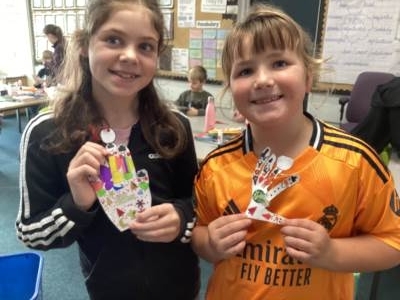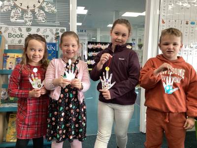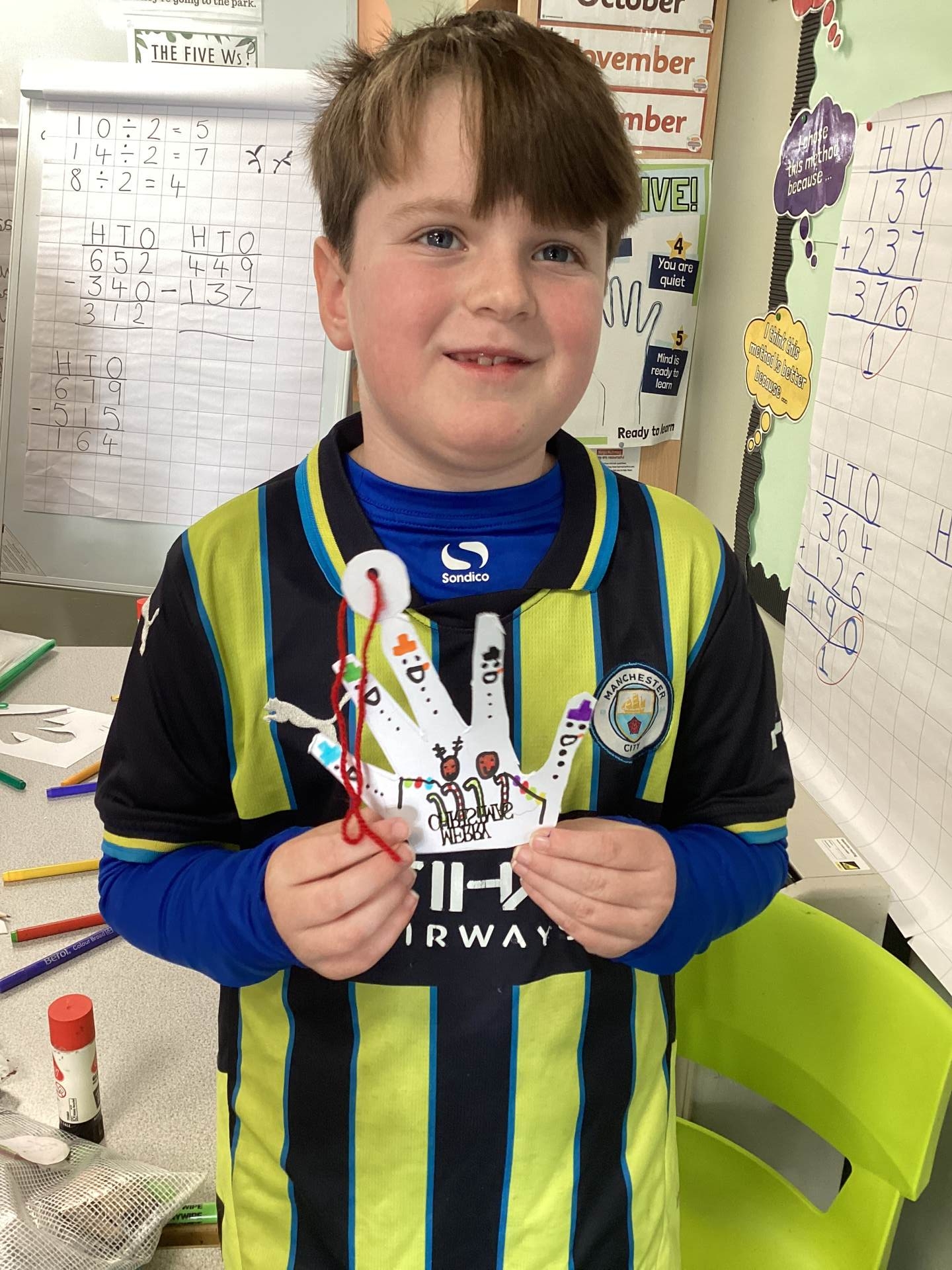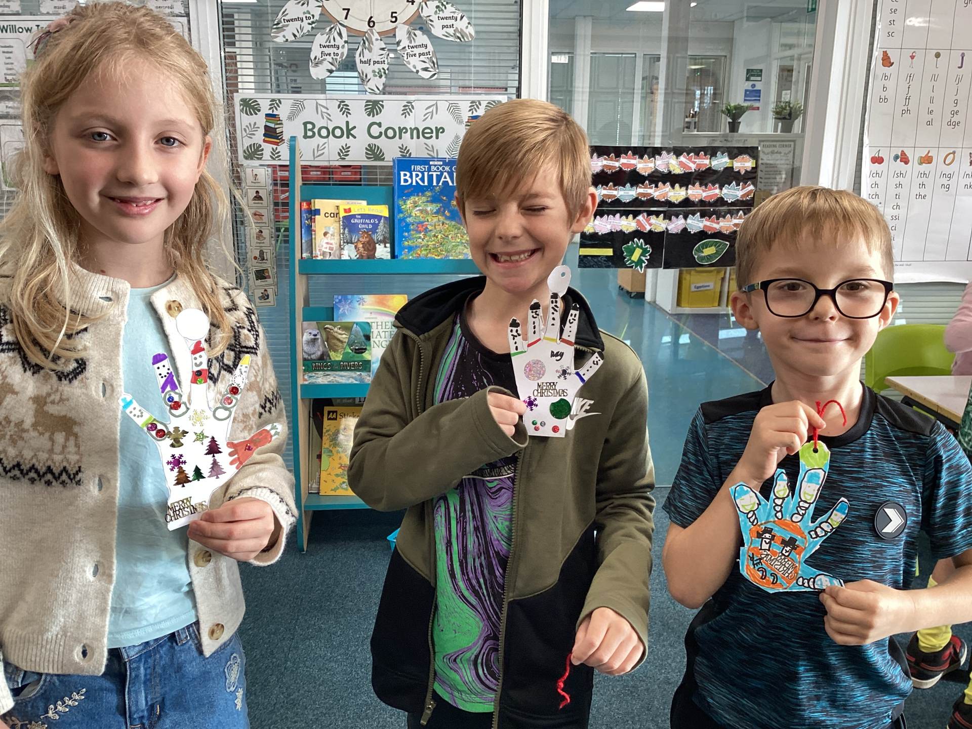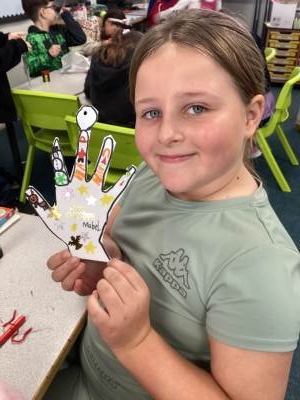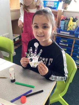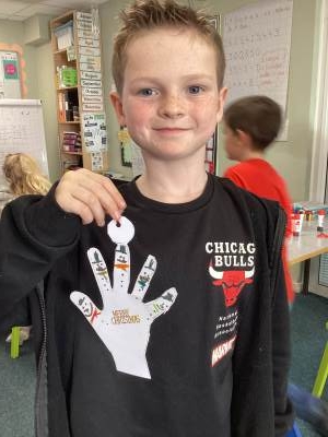 Today, in time for our Christmas Fair, the children made their decoration for the huge tree in the school hall. They used white card, drew around their hand and then decorated their drawn fingers as snow people, reindeers, Father Christmas or elves! They then used different shiny sequins to add a bit of Christmas sparkle to their fantastic decorations! Once made they then placed them on the Christmas tree next to the others made from other classes.