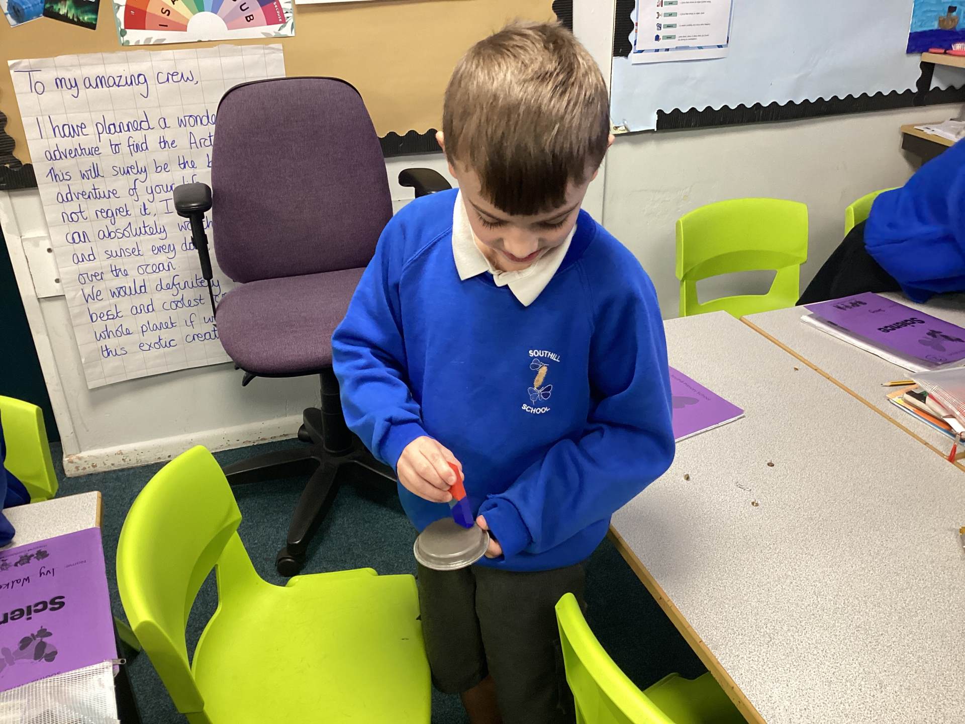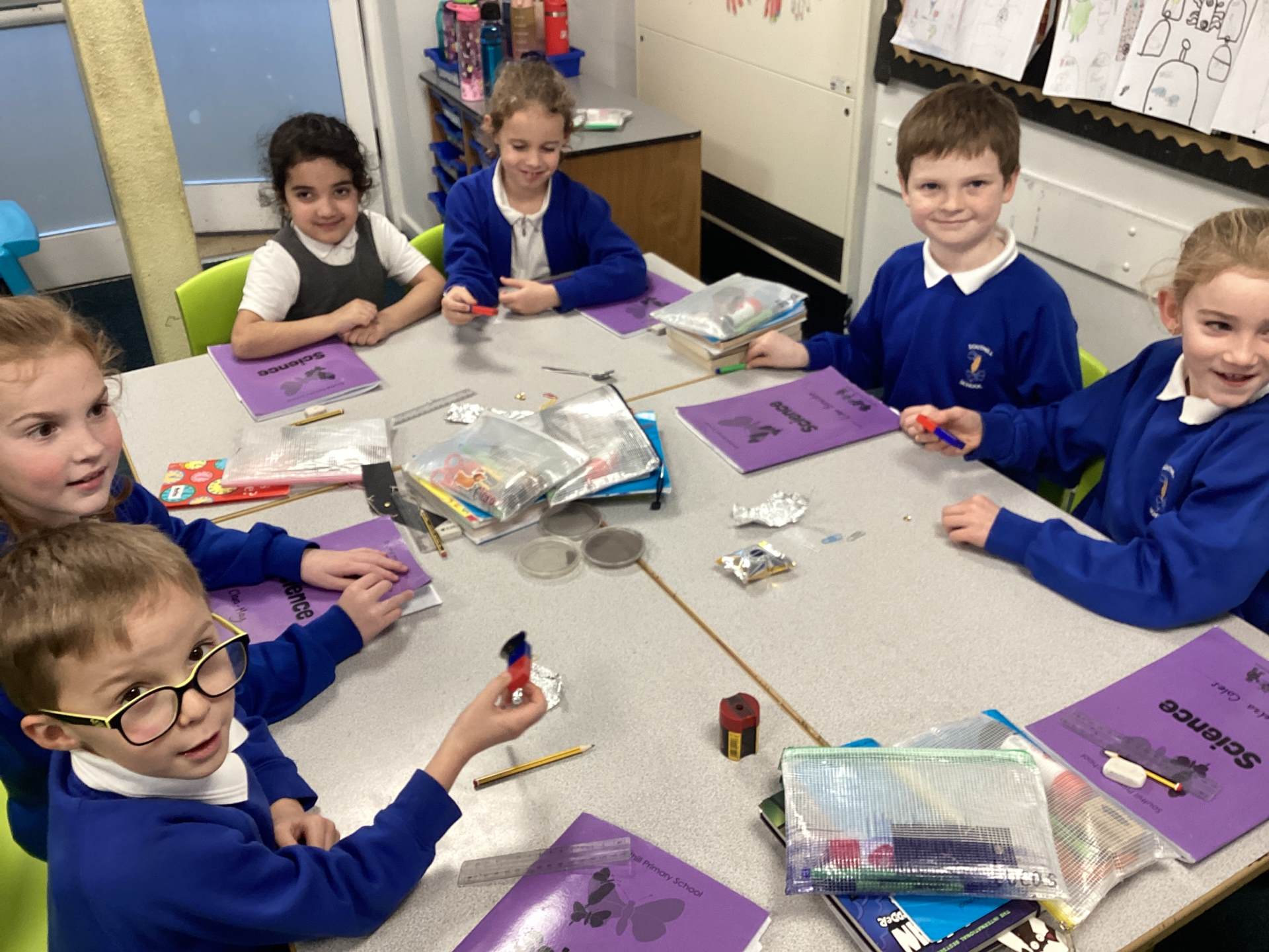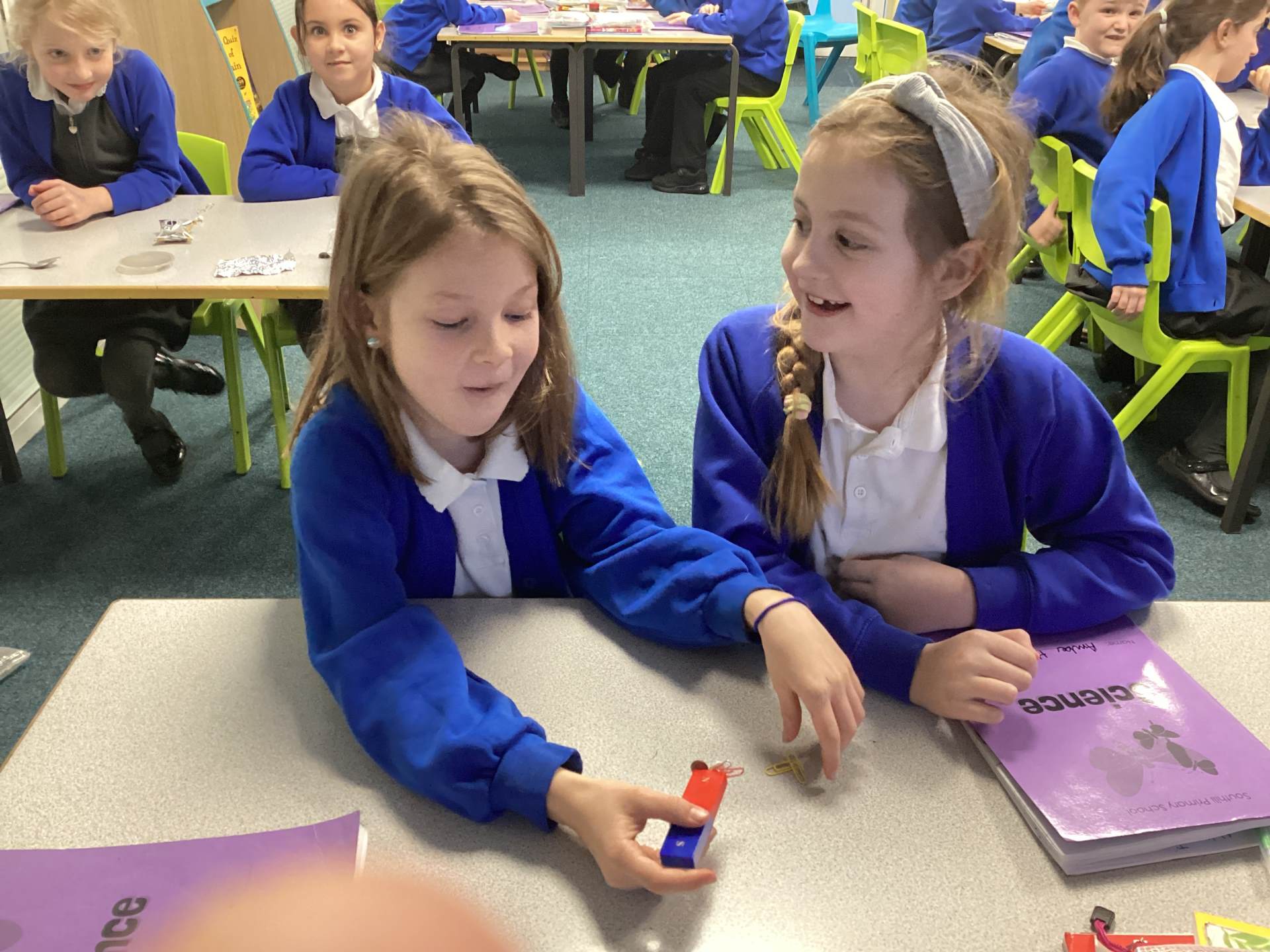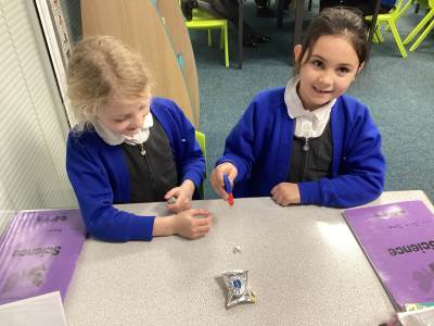 Continuing with our Science unit, Forces and Magnets, the children explored different metals and metallic objects to see if they were magnetic or non-magnetic. Before having a magnet, the children were given a variety of materials to handle and were asked to make a prediction as to whether it would be magnetic or non-magnetic. There was lots of discussion and reasoning and once all children had made their predictions magnets were handed out. The children really enjoyed feeling the 'pull' of the magnet and watching the magnetic objects move towards to magnet. One group tricked me into thinking that aluminium foil was magnetic, by wrapping magnetic objects up in it!