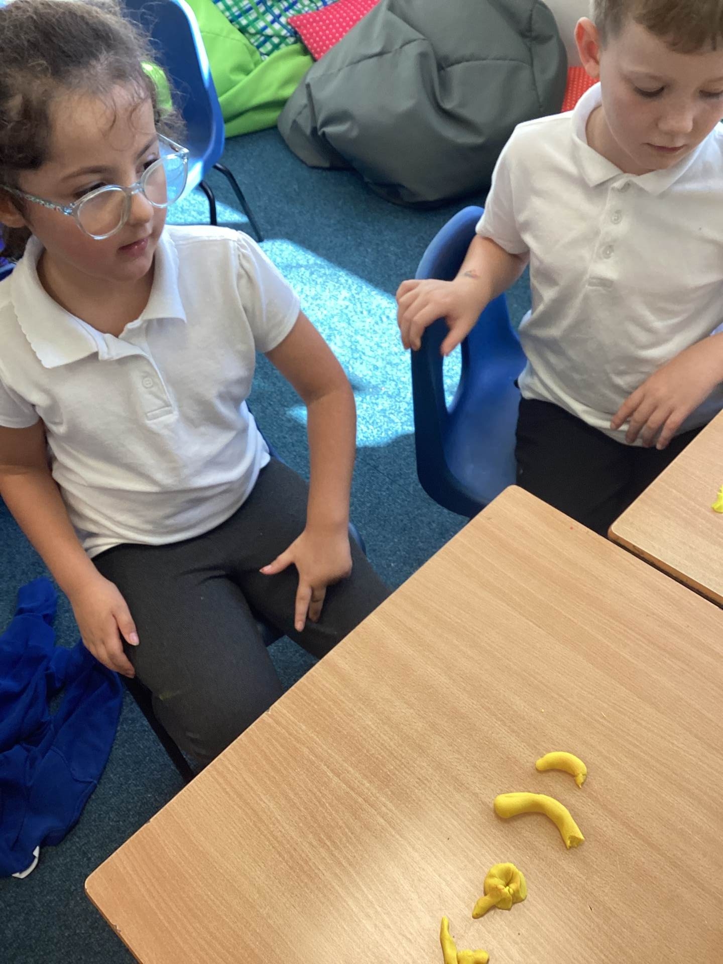 In Art, our topic is sculpture, so we started the week by using playdough to mould different shapes. The children challenged themselves to make long sausages, hamburgers, the letters of their names, full words – and even some very impressive playdough cats (of course!) They showed great creativity and had lots of fun getting stuck in.