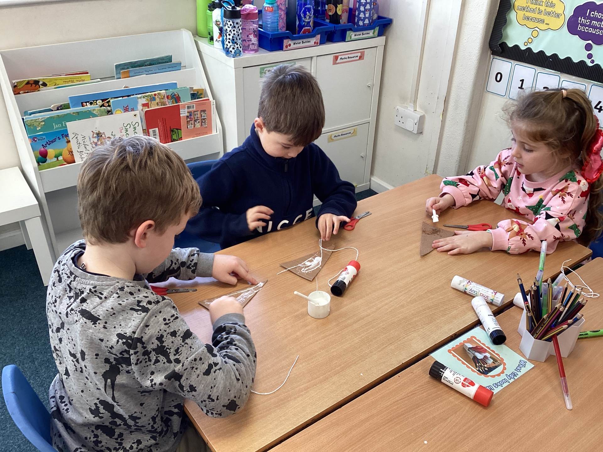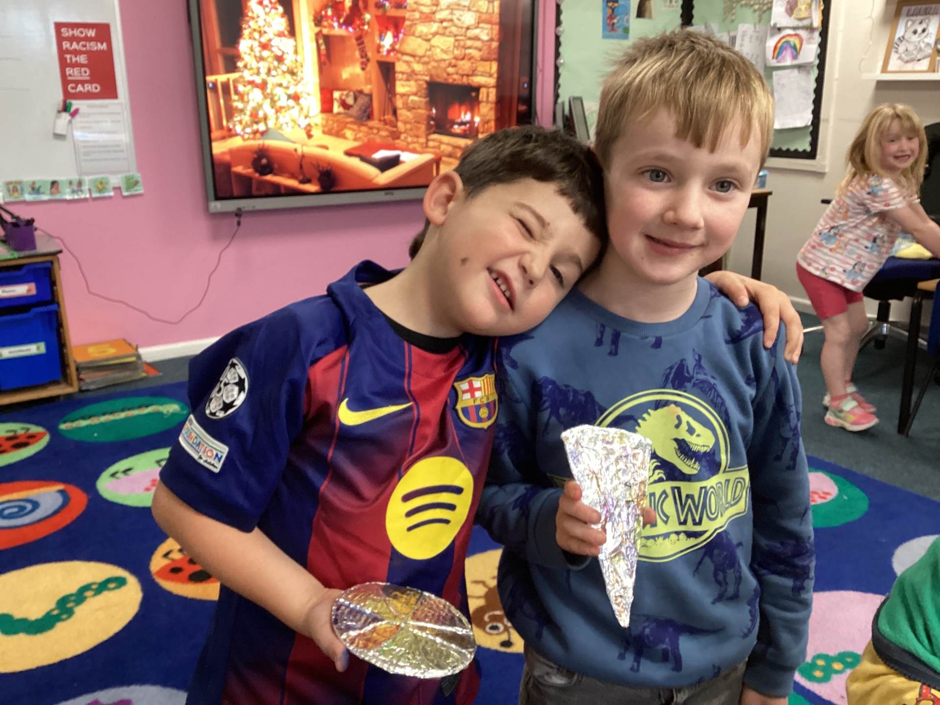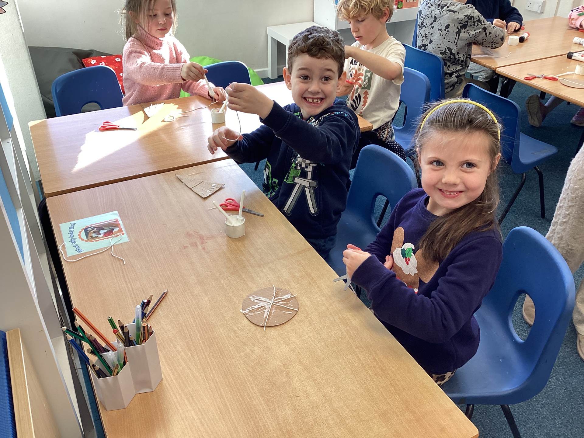 To finish the week, we got properly festive by making our very own Christmas decorations. Using cardboard, string, foil, and felt tips, the children created stunning stained-glass style baubles and Christmas trees. First, we arranged and glued string onto the cardboard in different shapes. Then we carefully placed foil over the top and smoothed it down so the raised patterns shone through. Finally, we coloured in the shapes, creating beautiful, bright designs that shimmer and shine. They look magical!