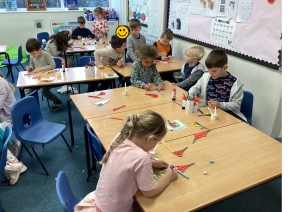 In maths, we’ve been exploring 2D and 3D shapes by making all sorts of patterns and talking about what makes shapes the same or different. The children have been practising naming the shapes, spotting them in repeating patterns, and using them to make their own patterns!