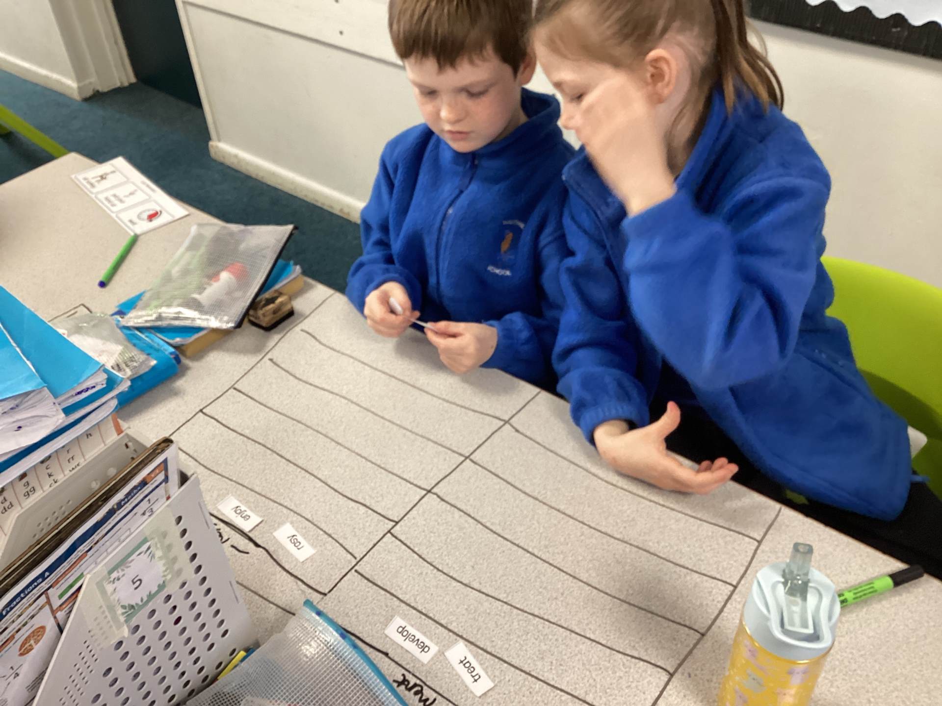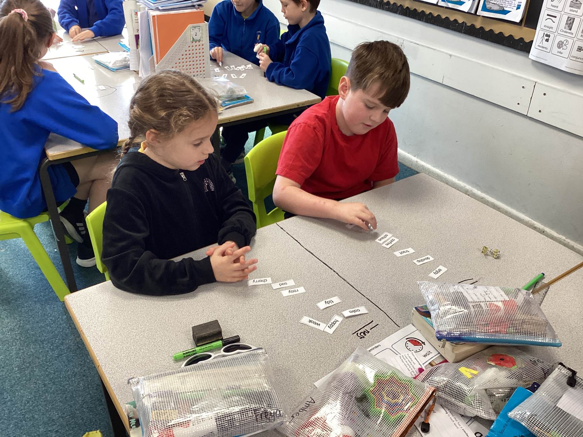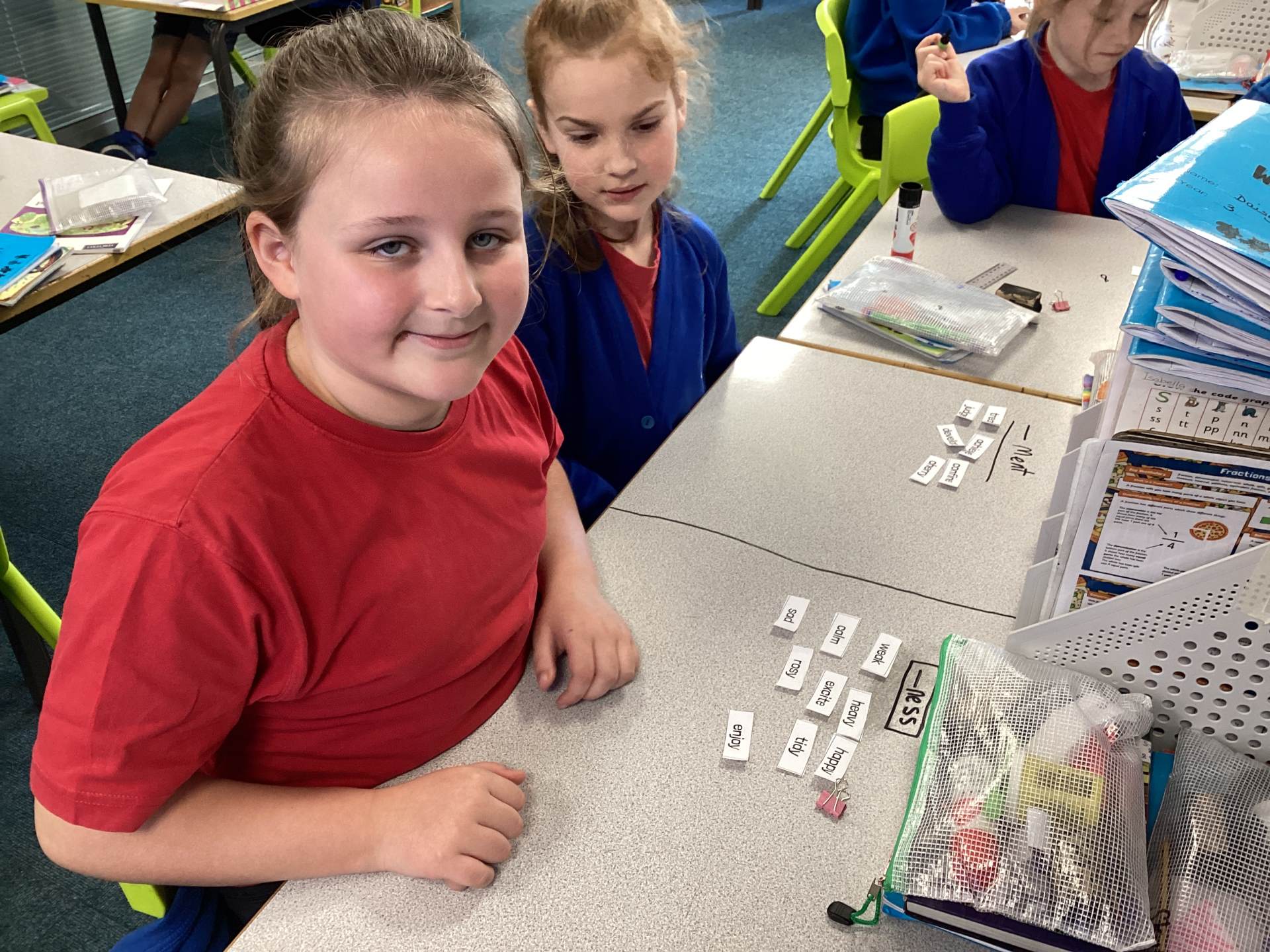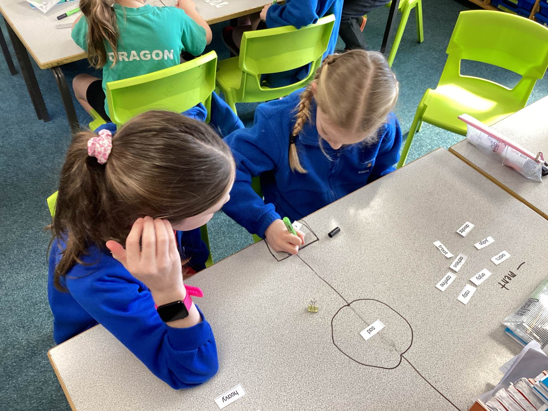 This week the children in year 3 were learning about the suffixes -ness and -ment. They had to work as a team to decide where root words would go in a table that they had drawn on the table! There was some great discussion and deliberation and just to make them work that bit harder, I told them there was a word within their pile that couldn't go into either side of the suffix table!