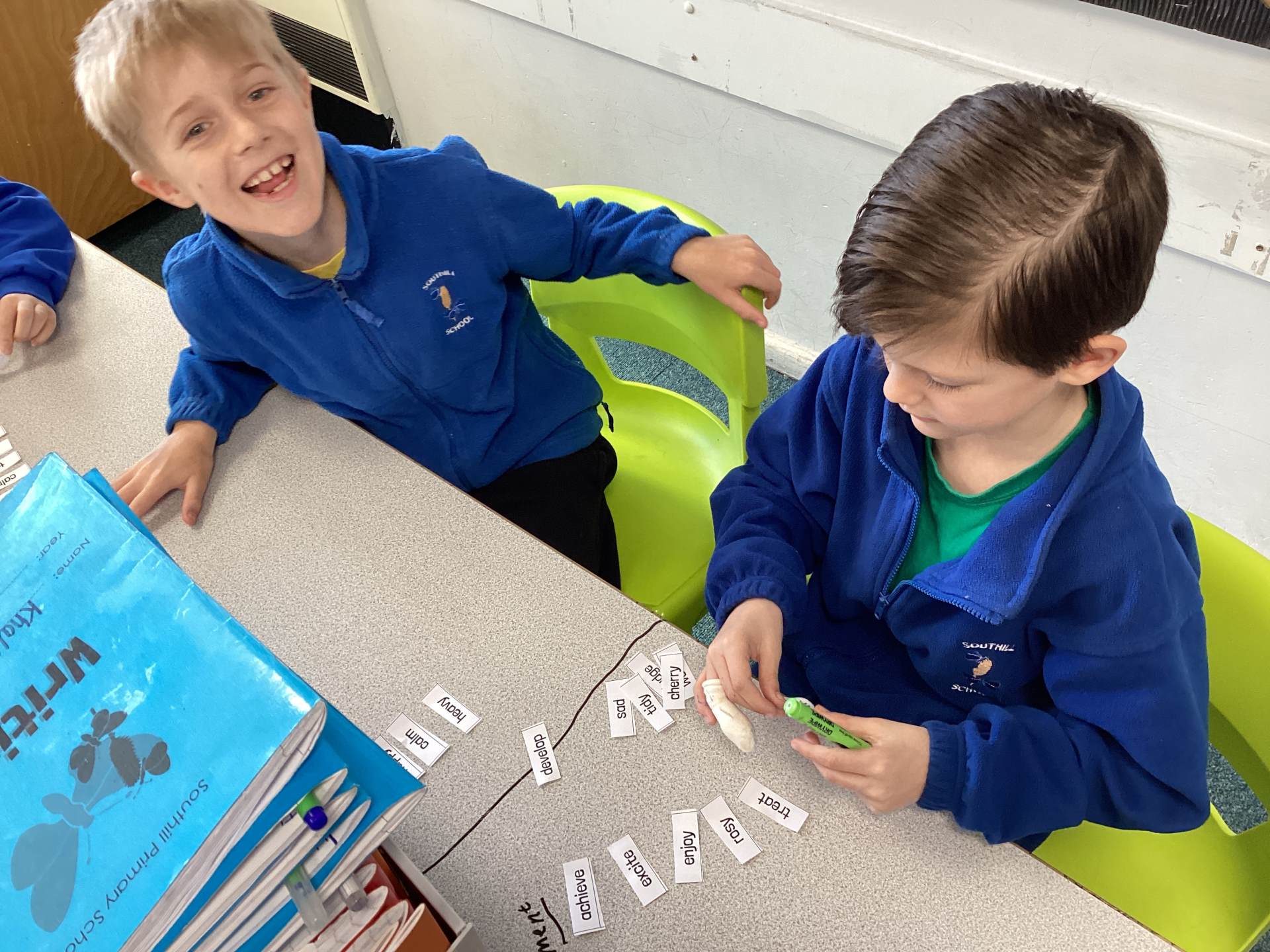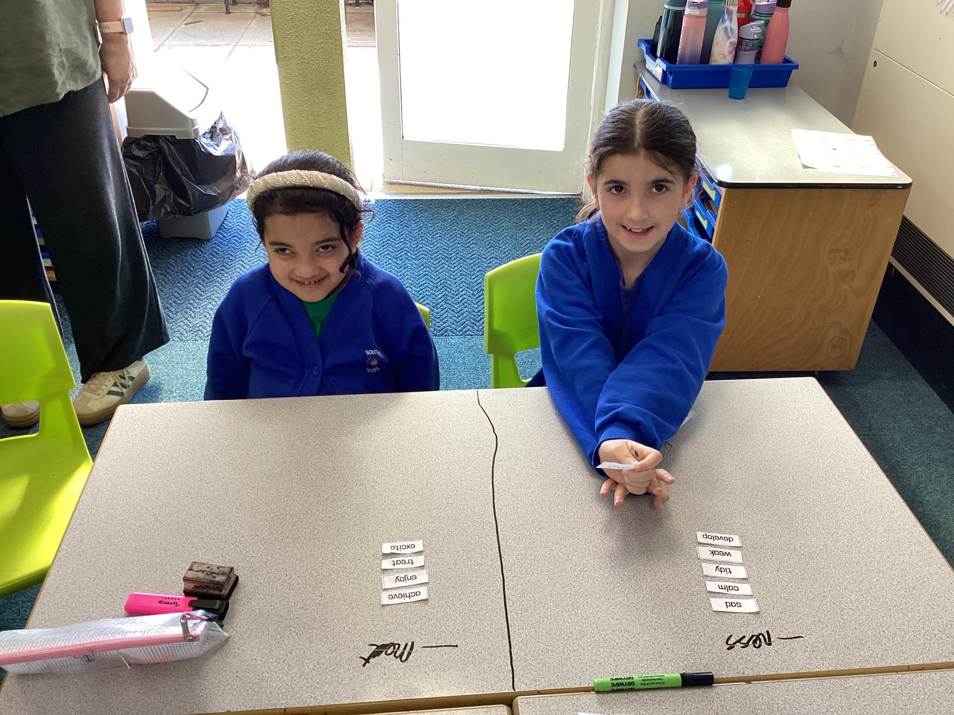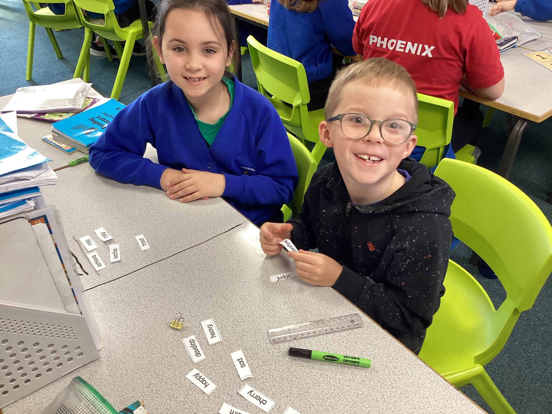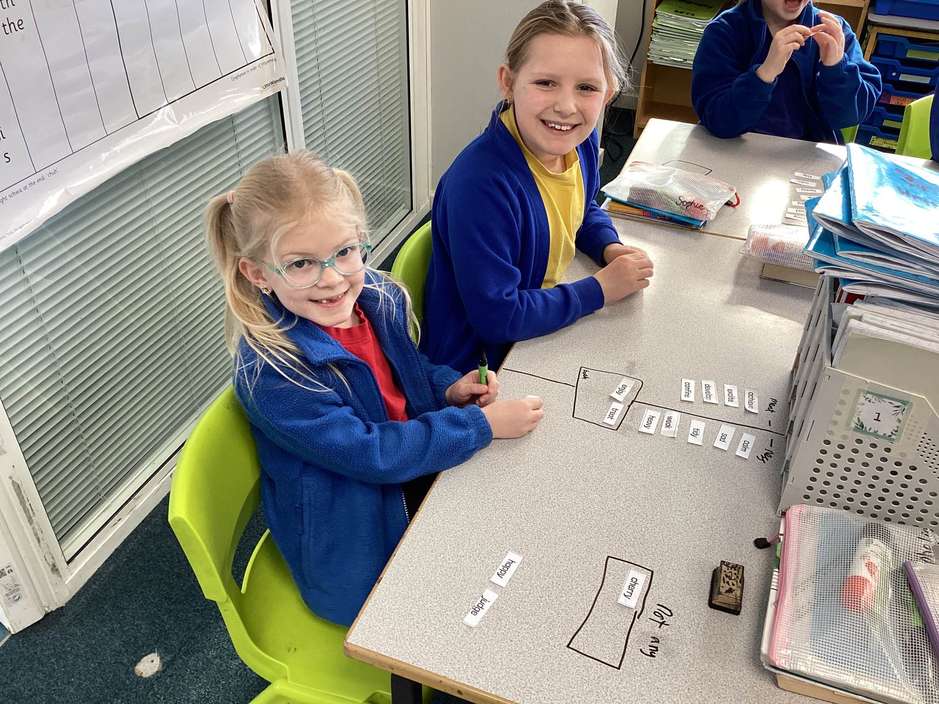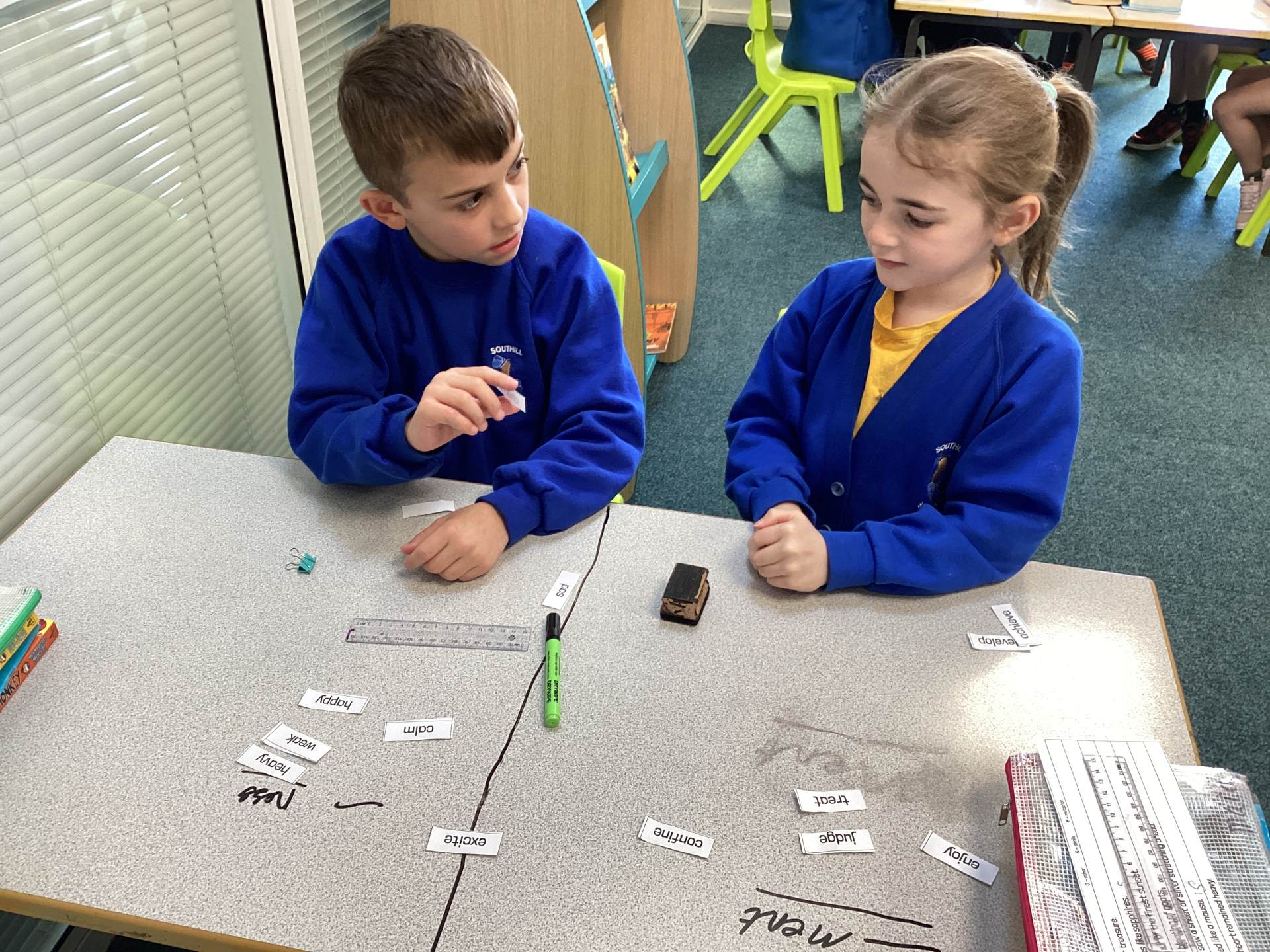 This week the children in year 3 were learning about the suffixes -ness and -ment. They had to work as a team to decide where root words would go in a table that they had drawn on the table! There was some great discussion and deliberation and just to make them work that bit harder, I told them there was a word within their pile that couldn't go into either side of the suffix table!