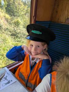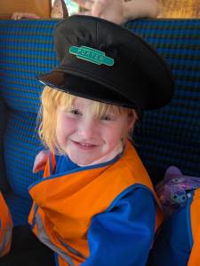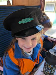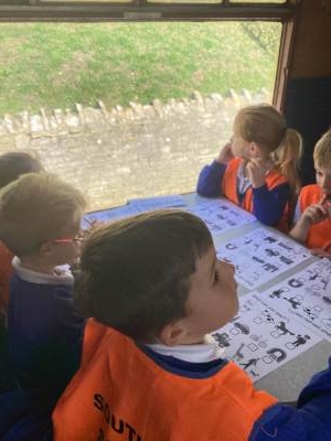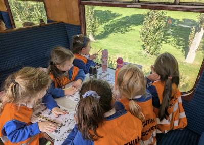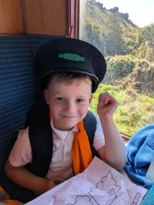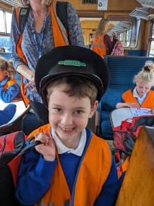 On the way back, we had the chance to meet some of the train guards, who talked to the children about the train. During the return journey, the class took part in a spotting activity, looking out of the window to see what they could find in the countryside. There were cows, birds, sheep, and a castle spotted… and then came the giraffe on the sheet. Several children had a good look out of the windows—just in case!