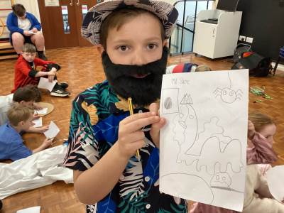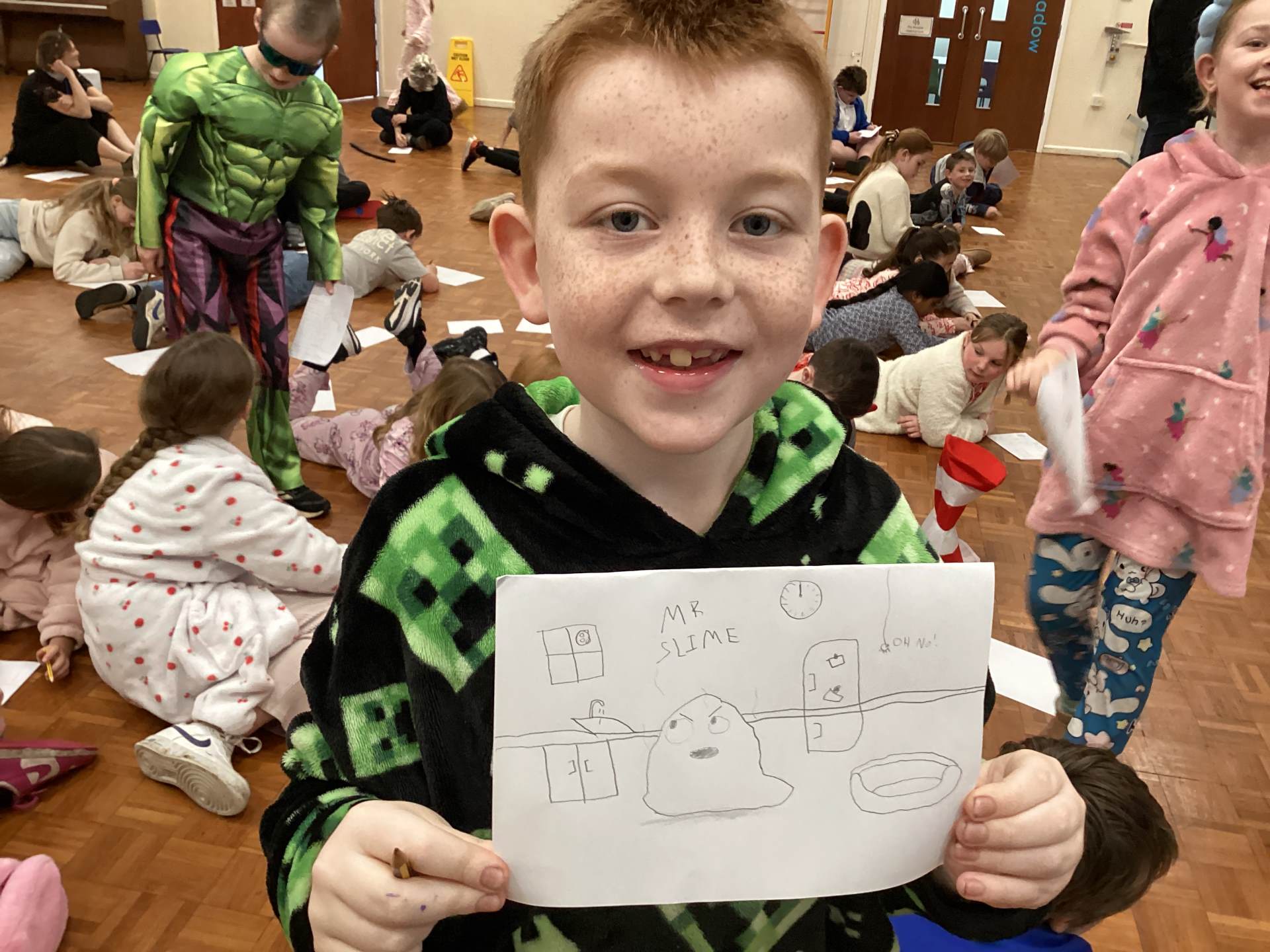 After the assembly, pupils in Years 5 and 6 were given an exciting opportunity to take part in a workshop with Alex. During the session, he read two poems aloud and, as we listened, we were challenged to sketch the images that came to mind. Mr. Slime and The Jelly Bean Thief were wonderfully weird and imaginative poems that truly got our creative juices flowing. We even got to write our very own piece of poetry which a few children were very brave to perform in front of the rest of the two classes.