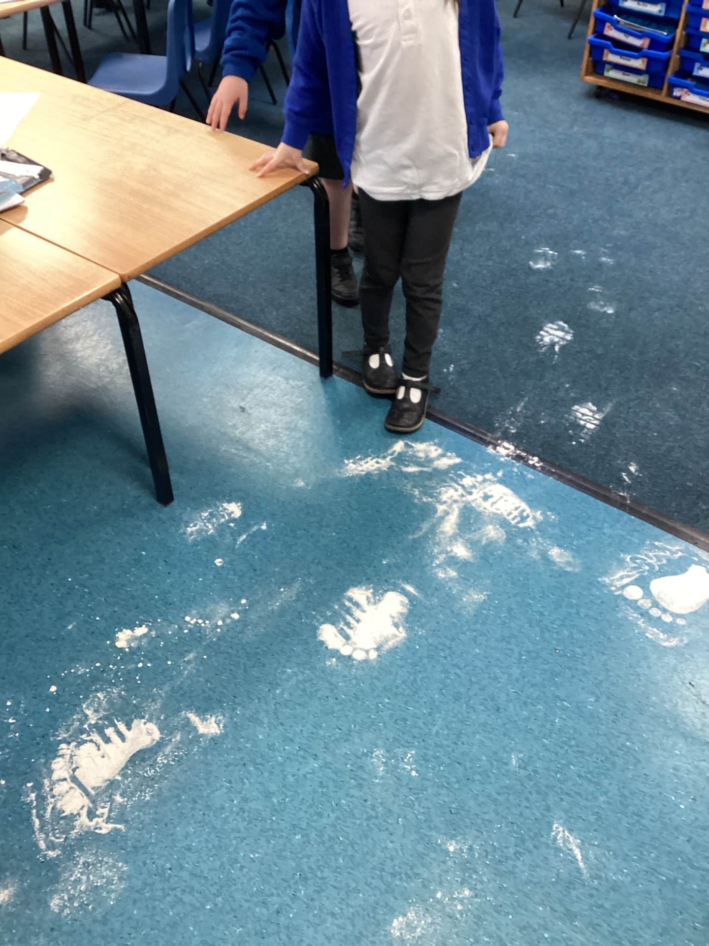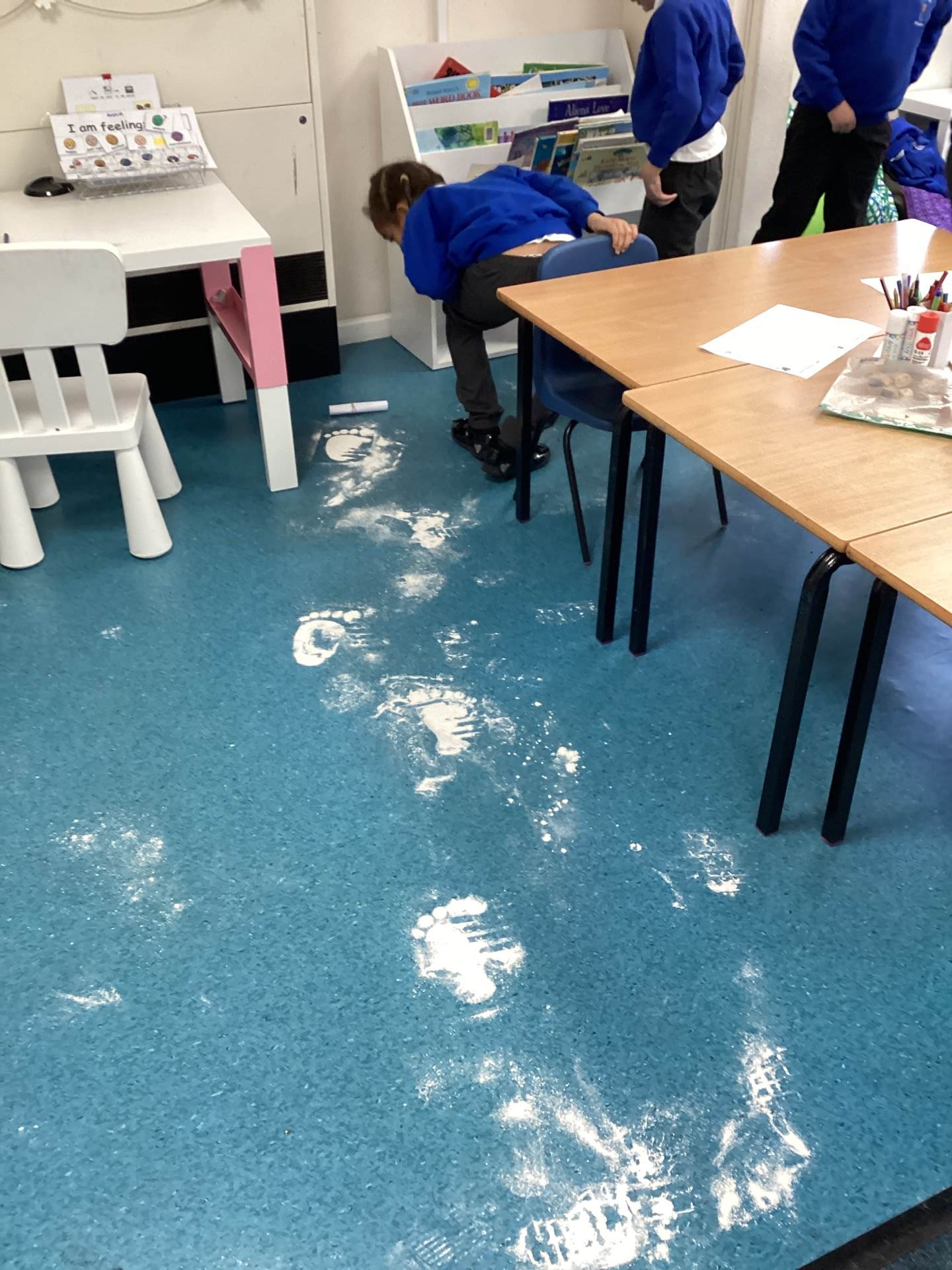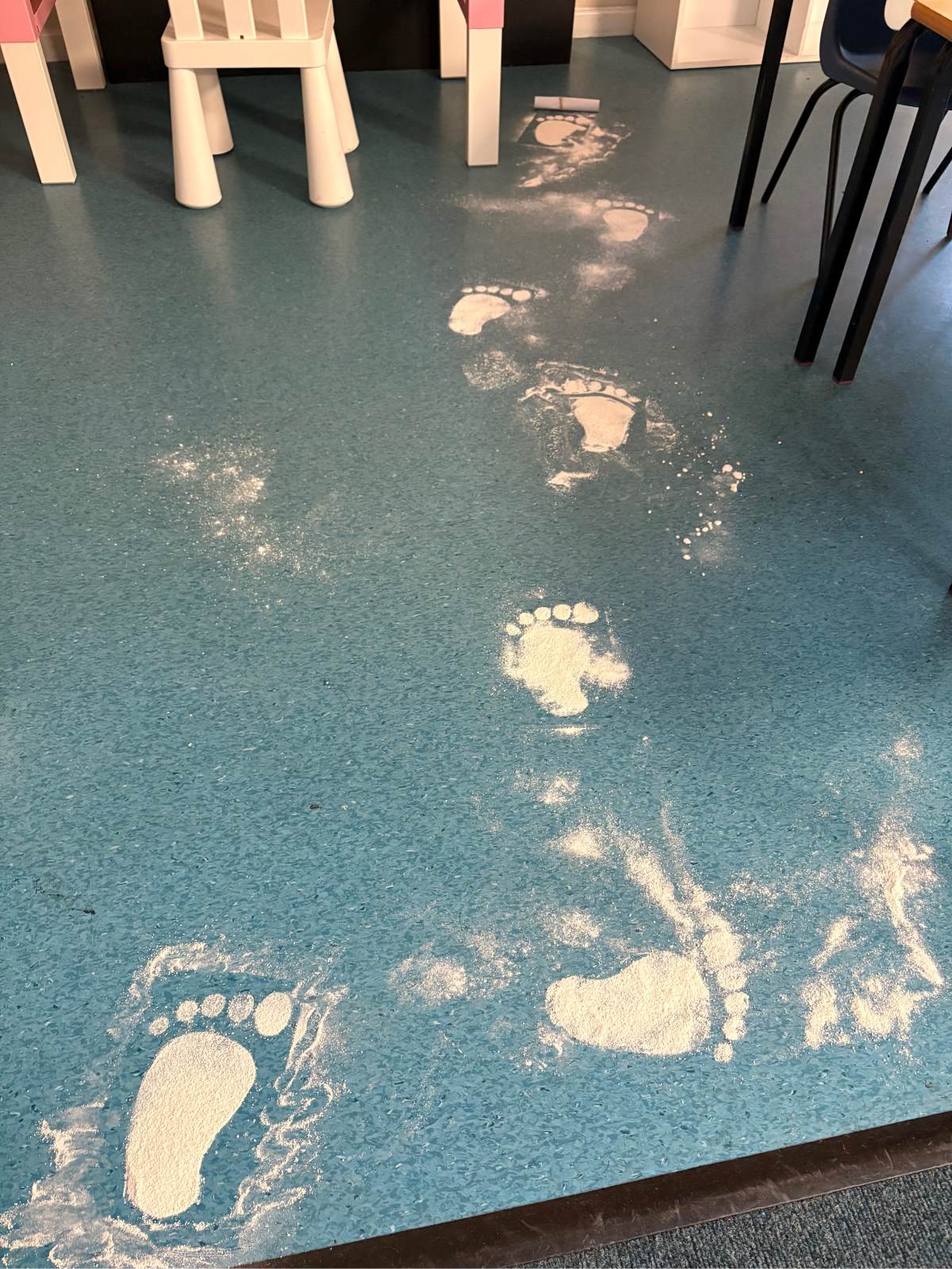 As the children walked into the classroom, they stopped in their tracks. Stretching across the classroom were huge, white footprints. They were much bigger than any grown-up’s shoes and looked very mysterious indeed!