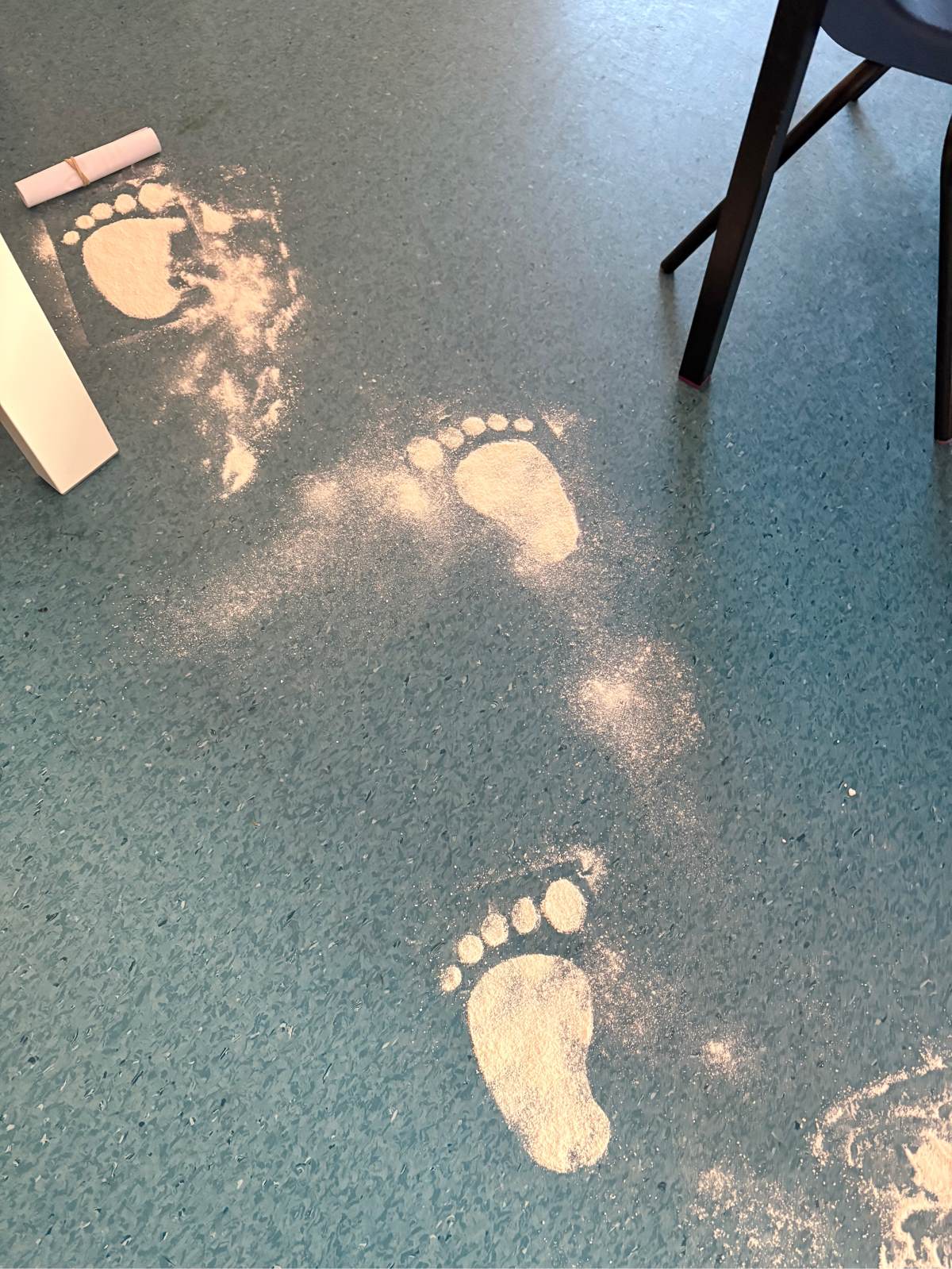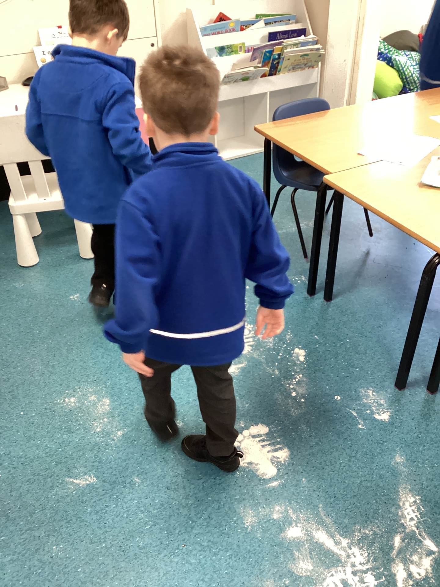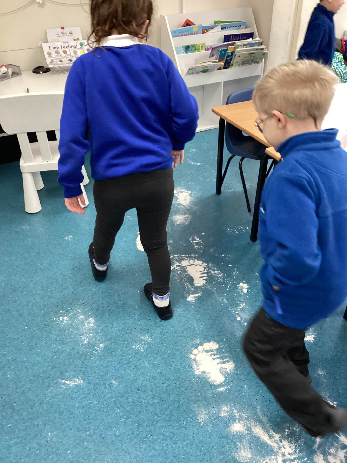 As the children walked into the classroom, they stopped in their tracks. Stretching across the classroom were huge, white footprints. They were much bigger than any grown-up’s shoes and looked very mysterious indeed!